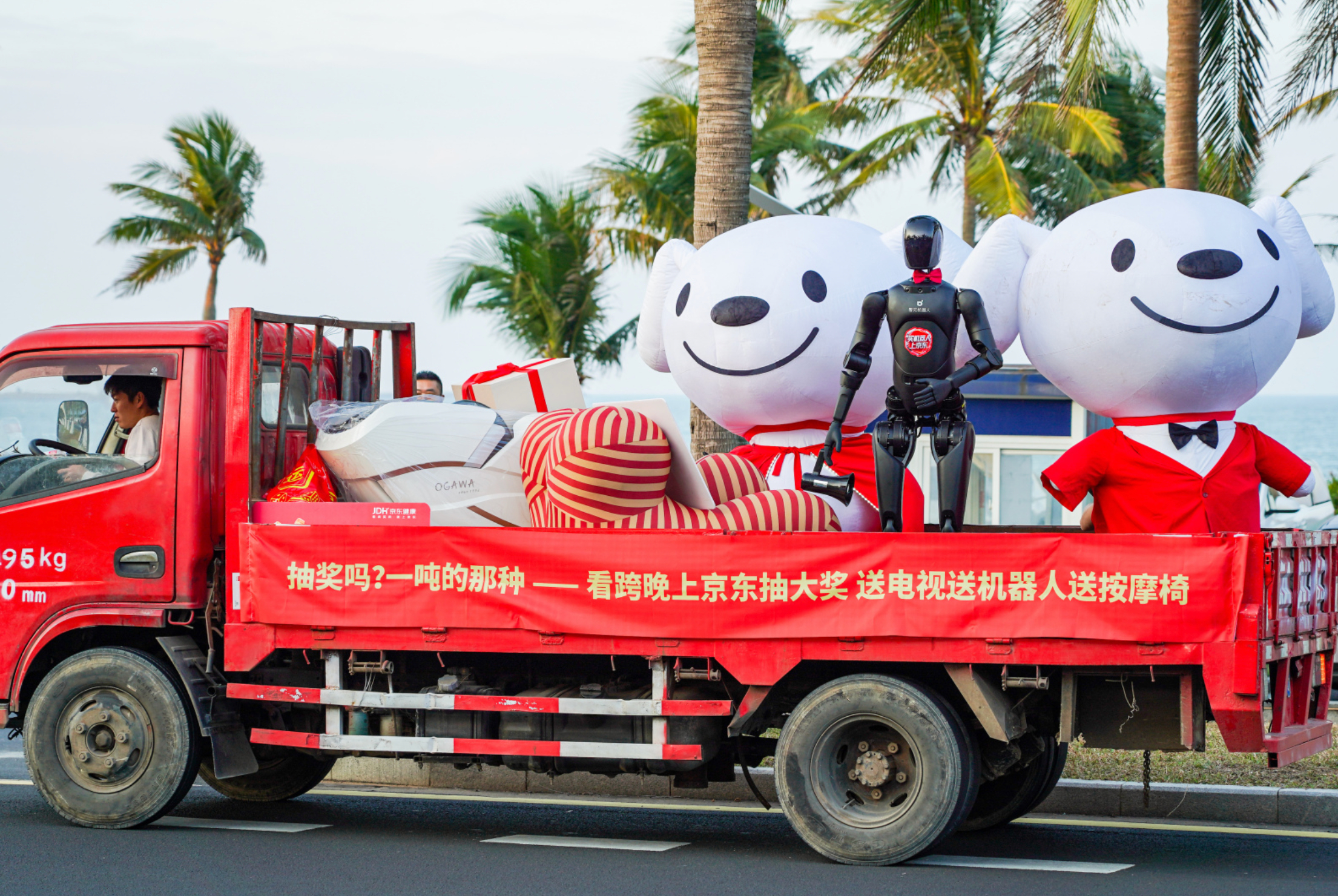 网友偶遇京东跨晚大奖车在海口街头直接被这辆“显眼包”震住!7米2的红色欧气卡车也太拉风了,里面装的是价值25万的「一路红」终极礼包吧?电视、按摩椅、健康卡…感觉整条街的运气都被它吸走了!🚛💨