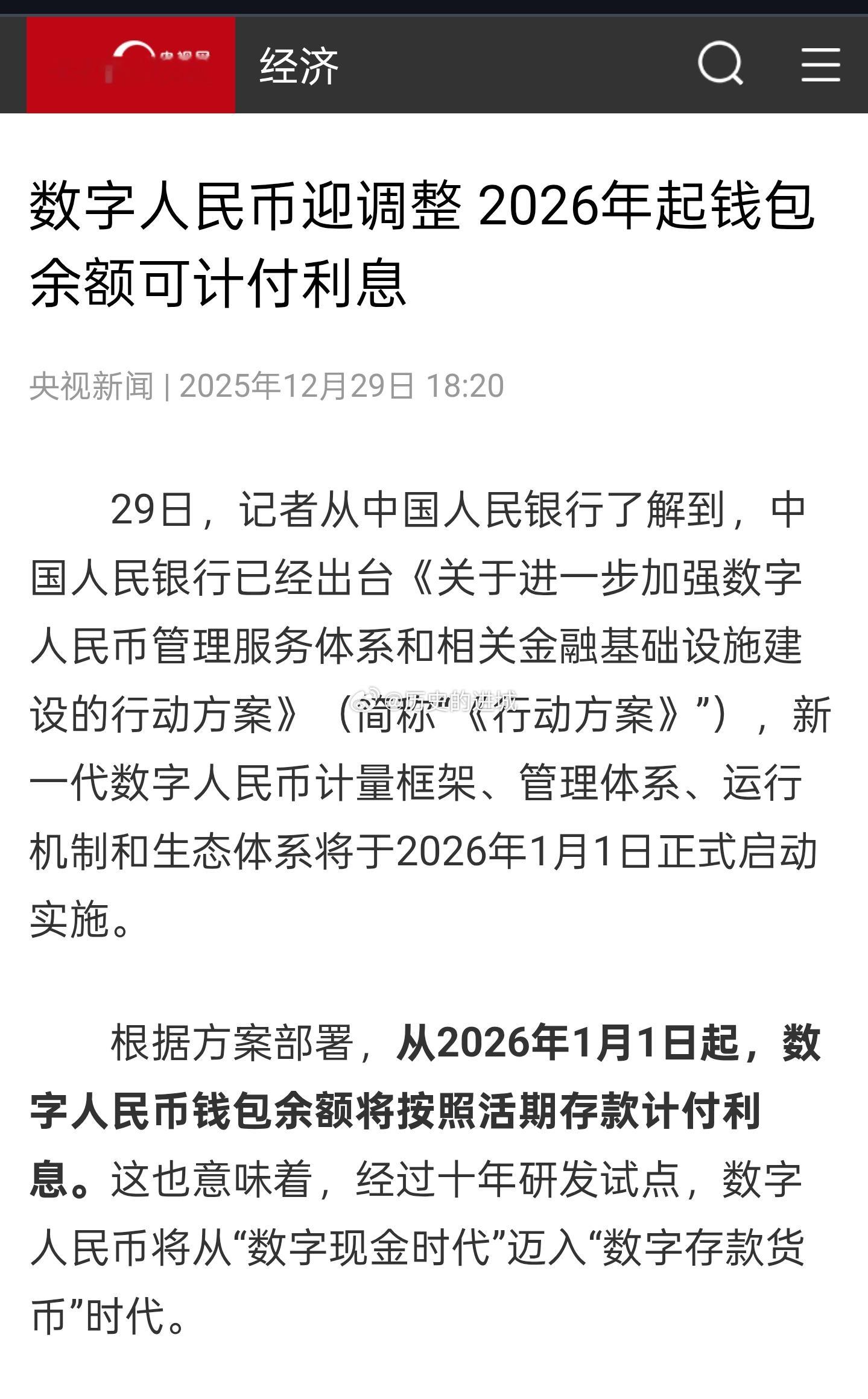 央视:央行已出台数字人民币行动方案,明年1月1日正式启动实施。中国人民银行已经出台《关于进一步加强数字人民币管理服务体系和相关金融基础设施建设的行动方案》,新一代数字人民币计量框架、管理体系、运行机制和生态体系将于2026年1月1日正式启动实施。