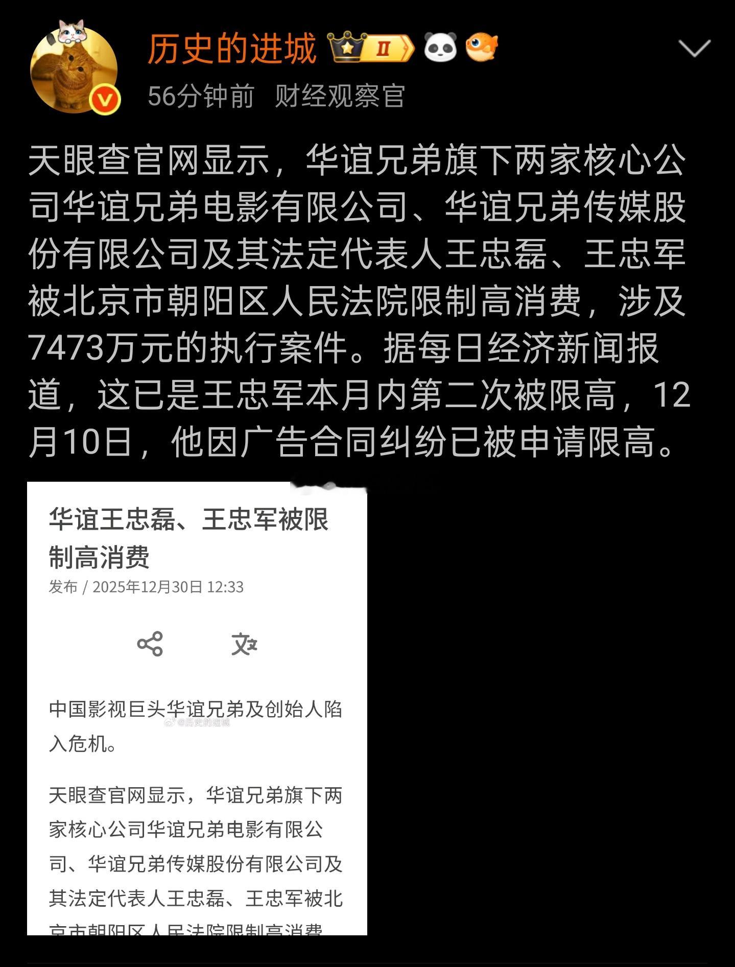 天眼查官网显示,华谊兄弟旗下两家核心公司华谊兄弟电影有限公司、华谊兄弟传媒股份有