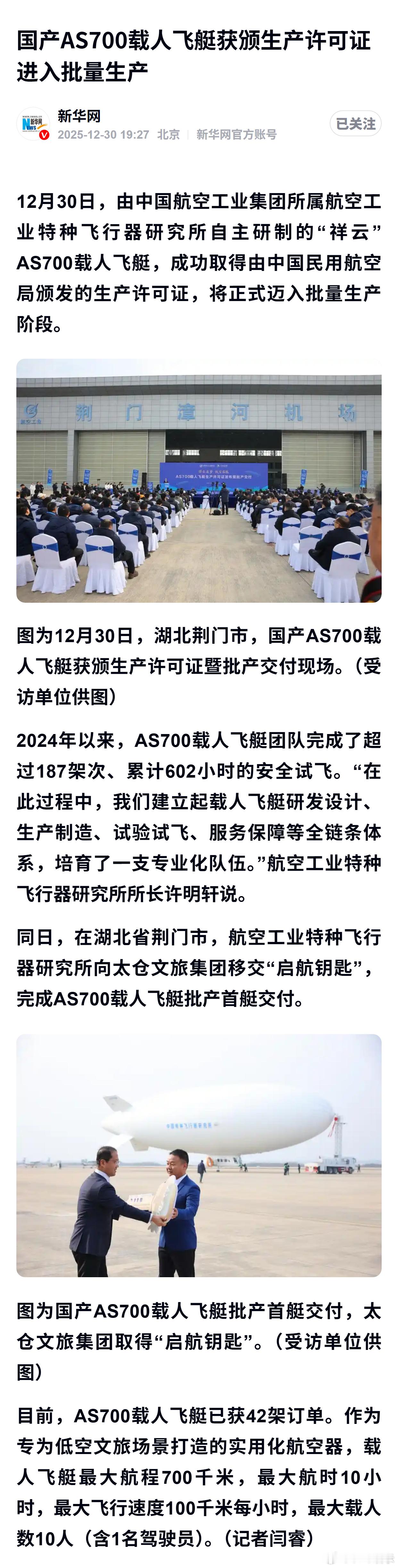 国产AS700载人飞艇获颁生产许可证进入批量生产