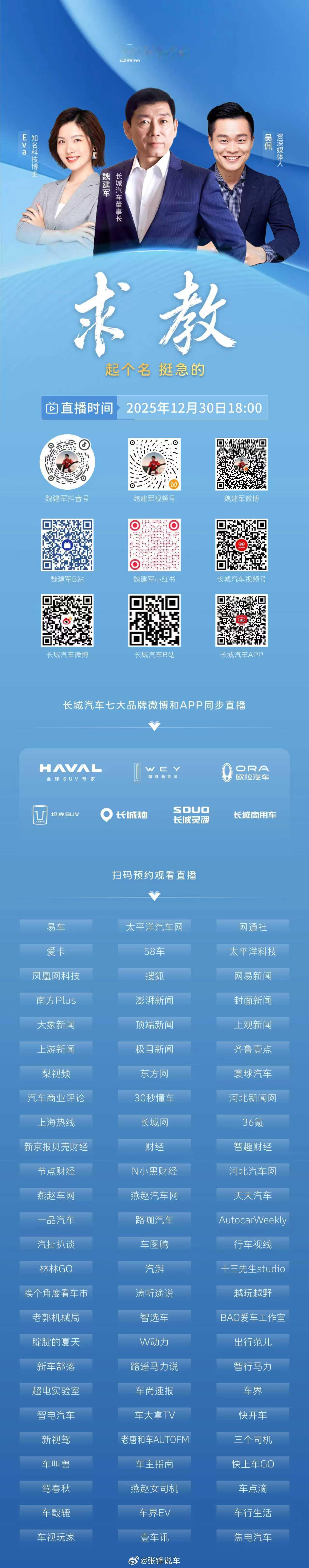 魏建军带着全新平台来《求教》啦!今晚18:00 全网直播!长城汽车董事长魏建军将与资深媒体人吴佩、知名科技博主Eva围绕全新平台征名及长城汽车技术价值观展开深入交流,你的创意命名说不定当场被点名表扬!锁定长城汽车直播间,共话长城汽车新平台,见证中国汽车硬核底气!