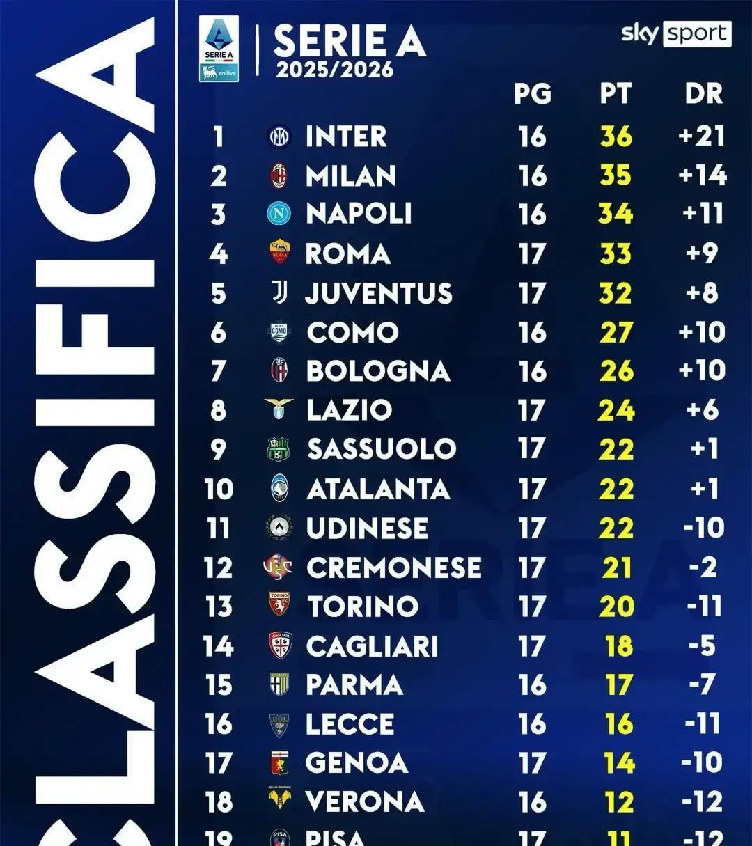 国米4分领先,尤文还少赛一场 第17轮打完,积分榜像被橡皮擦过,差距重新拉开。国米44分,火力防守双第一;尤文40分,手里还捏着一场补赛。 米兰36分,罗马32分,亚特兰大30分,五队抢四个欧冠名额。亚特兰大最近5轮4胜1平,势头最猛。 保级区更惨。佛罗伦萨15分,离降级区只剩3分;恩波利16分、萨勒尼塔纳12分,谁掉下去都不奇怪。 接下来三周,国米要连碰拉齐奥、佛罗伦萨、尤文,三线作战,体能是最大敌人。 米兰门将迈尼昂伤停两周,防线不稳,随时可能被身后球队超车。 冬窗还没开,罗马已经在谈尤文的基恩,前锋补一口血,争四剧本可能再改。