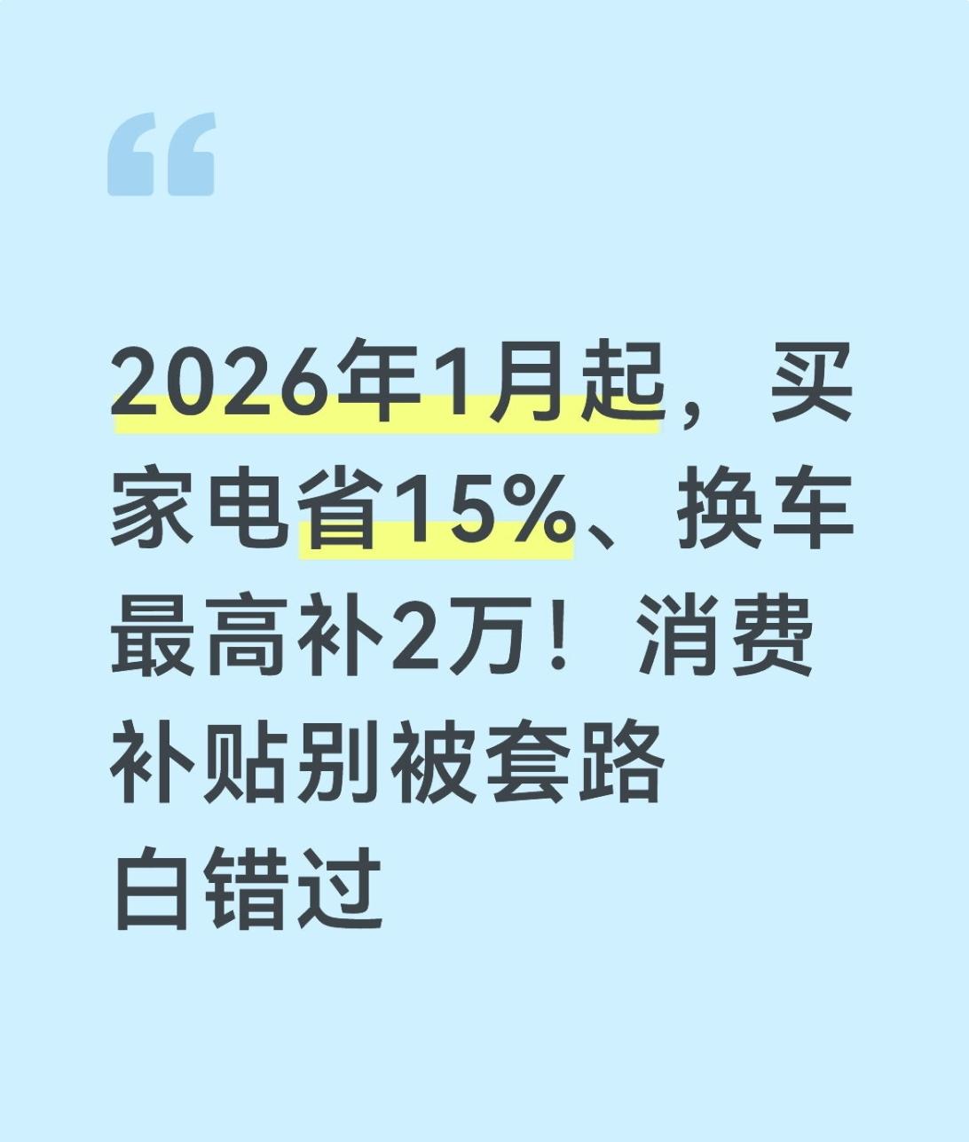 2026年1月1日家电、汽车以旧换新国补正式落地,买1万元一级能效空调能省1500元,报废旧车买新能源车最高补2万元,可不少消费者发现“看似省了钱,实则被商家套路”。全国已有超500起消费者投诉,反映商家通过“先涨价再补贴”抵消优惠,今天就用实在话讲清楚,补贴的具体规则、能省多少钱,以及避开套路的实操办法。 一、先算明白:家电汽车补贴怎么领,一笔账算清省多少 2026年的消费补贴不是“一刀切”,家电和汽车的补贴比例、上限都有明确规矩,算对了才能拿到真优惠。 1. 家电补贴:6类产品补15%,单件最高补1500元 冰箱、洗衣机、电视、空调、电脑、热水器这6类家电,按售价15%补贴,但每件补贴不超1500元。比如买1.2万元的一级能效空调,1.2万×15%=1800元,实际只补1500元;买8000元的冰箱,8000×15%=1200元,就能拿满补贴。这里要纠偏:只有一级能效/水效的家电能领补贴,非达标产品一分都补不了。 2. 汽车补贴:报废比置换省更多,新能源车补贴力度更大 报废旧车买新能源车,按车价12%补,最高2万元;置换则按8%补,最高1.5万元。买20万元新能源车,报废补贴能拿2万元,置换只能拿1.5万元,差了5000元。燃油车报废补车价10%(最高1.5万),置换补6%(最高1.3万),且补贴不再是固定最高额,而是按新车价比例核算,车价越低补贴越少。 二、再避坑:商家这两个套路,让补贴成“空欢喜” 政策是实打实的惠民福利,但部分商家玩花样,让消费者看似省钱实则没享到实惠,这两个套路一定要避开。 1. “先涨后补”:标价虚高让补贴白搭 某品牌一级能效冰箱平时卖8000元,政策出台后标成9000元,按15%补1350元,消费者实际花7650元,比平时还贵150元。遇到这种情况,先查电商平台历史价格,发现涨价直接换商家,别被“补贴”噱头忽悠。 2. 捆绑销售:强制买配件才给申请补贴 有些家电卖场、4S店要求消费者买延保、加装内饰,才协助办理补贴,这是违规行为。政策明确补贴与消费捆绑无关,只要产品符合标准,商家就必须配合申请,遇到这种情况直接打12315投诉。 还要提醒:补贴资金由财政直接发放,不会经过商家之手,若商家声称“代领补贴要扣手续费”,属于欺诈,可向当地发改委举报。 三、最后划重点:这样申领补贴,最快15天到账 补贴申领流程已简化,线上线下都能办,按这步骤来,不用跑冤枉路。 1. 家电补贴:线下门店直接抵扣,线上平台自动核补 在合作门店买家电,店员会现场审核产品资质,直接在售价里扣补贴;线上平台购买时,认准“政府监管补贴”标识,下单自动抵扣,补贴最迟7个工作日到账。 2. 汽车补贴:4S店协助一站式申请,也可线上自主申报 购车时让4S店核验旧车报废/置换证明,统一提交审核;若商家不协助,可登录“全国汽车以旧换新信息管理平台”上传材料,审核通过后15个工作日内补贴到账。 3. 咨询渠道:不懂政策打这些电话 不清楚产品是否符合补贴标准,拨12345政务热线;遇商家违规,打12315投诉;汽车补贴细则可咨询当地工信厅,家电补贴可问商务局。 2026年的消费补贴是真金白银的福利,别被商家套路挡住优惠,也别因嫌麻烦错过省钱机会。补贴政策全年有效,可根据自身需求择机消费,把实惠攥到手。 你打算用补贴买家电还是换汽车?有没有遇到过商家的补贴套路?欢迎在评论区分享,觉得内容有用的话,点赞关注,后续还会分享更多消费省钱技巧!