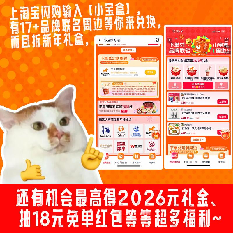 打工人新年自救指南get!淘宝闪购小宝盒专治各种水逆焦虑!我怀疑淘宝闪购小宝盒在憋大招上淘宝闪购输入【小宝盒】,有17+品牌联名周边等你来兑换,而且拆新年礼盒,还有机会最高得2026元礼金、抽18元免单红包等等超多福利,把工位变成好运聚集地,2026升职加薪buff叠满!双旦上淘宝闪购接好运接淘宝闪购好运小宝盒