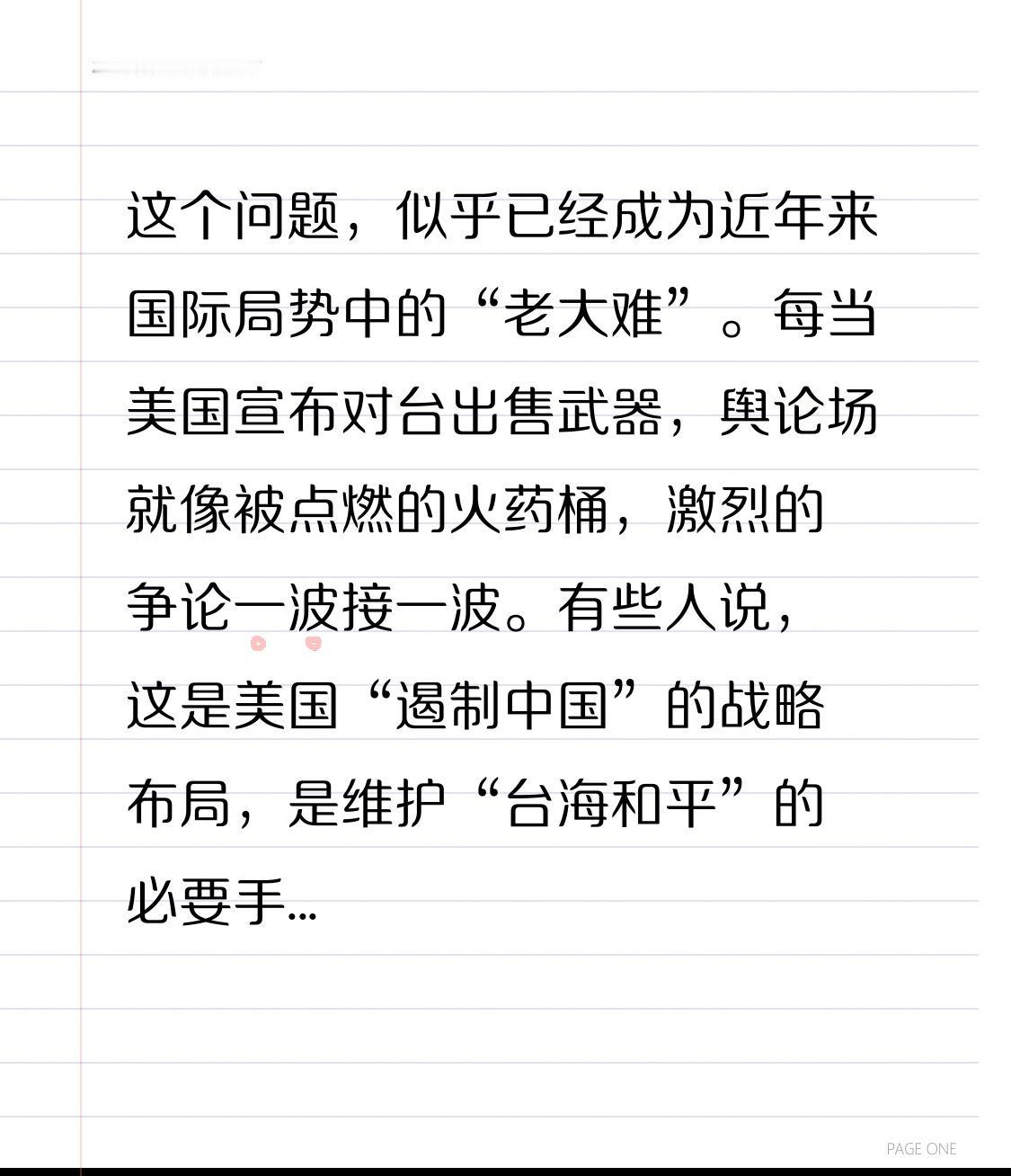 这个问题,似乎已经成为近年来国际局势中的“老大难”。每当美国宣布对台出售武器,舆论场就像被点燃的火药桶,激烈的争论一波接一波。有些人说,这是美国“遏制中国”的战略布局,是维护“台海和平”的必要手段;而另一些人则认为,这不过是某些势力在背后操控的“火中取栗”,故意挑衅、制造紧张局势,甚至是在“火上浇油”。 但细细想来,为什么美国屡屡对台出售武器?难道真是出于纯粹的“安全考虑”?还是另有隐情?其实,答案或许比我们表面看到的更复杂。美国的“对台售武”早已超越了单纯的军事交易,它背后隐藏着一场深层次的博弈——既是对中国崛起的遏制,也是对其在亚太地区影响力的维护。 更值得深思的是,为什么一些“看似理性的”西方媒体和政客,竟然会不断鼓吹“台海局势紧张”,甚至有人公开呼吁“支持台独”?难道他们真心希望两岸和平,还是在用“和平的名义”掩盖更深层次的战略意图?这些问题,值得每一个有责任心的中国人深思。 从某种角度看,这些“挑衅”行为,或许也反映出一些人内心的焦虑与不安。面对中国的崛起,他们或许感到威胁,试图用“制造危机”来转移注意力、稳住阵脚。而我们要做的,不是被动应对,而是要有更强的底气和智慧,用事实和理性去回应这些“挑衅”。 更重要的是,我们要看到,任何外部的压力和挑战,都不能动摇我们维护国家主权和领土完整的决心。正如一句古话所说:“风雨之后见彩虹。”只要我们团结一心,坚定信念,未来的台海局势,终究会迎来属于和平与稳定的曙光。 所以,面对美国屡屡对台售武的“挑衅”,我们更应该以理性、坚韧和智慧去应对,而不是被动被动“激怒”或“恐慌”。只有这样,才能真正捍卫我们的国家利益,也才能让那些试图挑衅的人知道,我们绝不会让任何人轻易得逞。 你怎么看?难道这些“挑衅”背后,真的没有深层次的战略意图?还是我们自己太过“善良”而被人利用?留言告诉我,你的看法! 希望你的喜欢关注点赞评论谢谢!