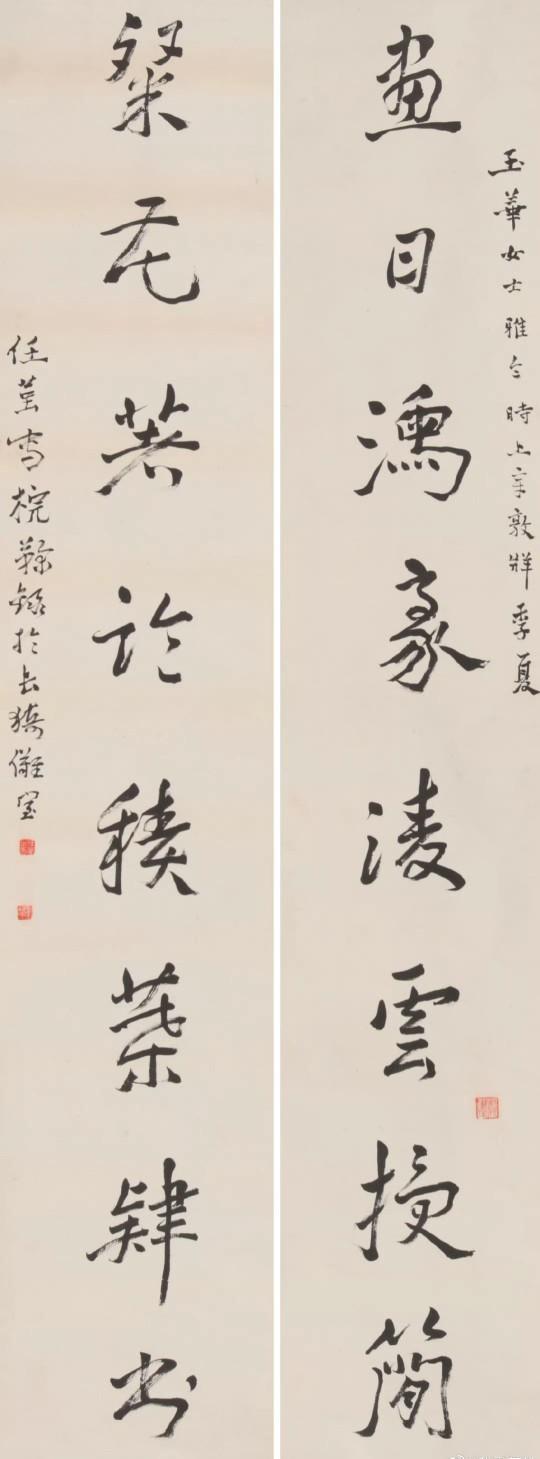 吴湖帆行书八言联​​​ 《清流激湍映带左右,朝晖夕阴气象万千》 吴增甲行
