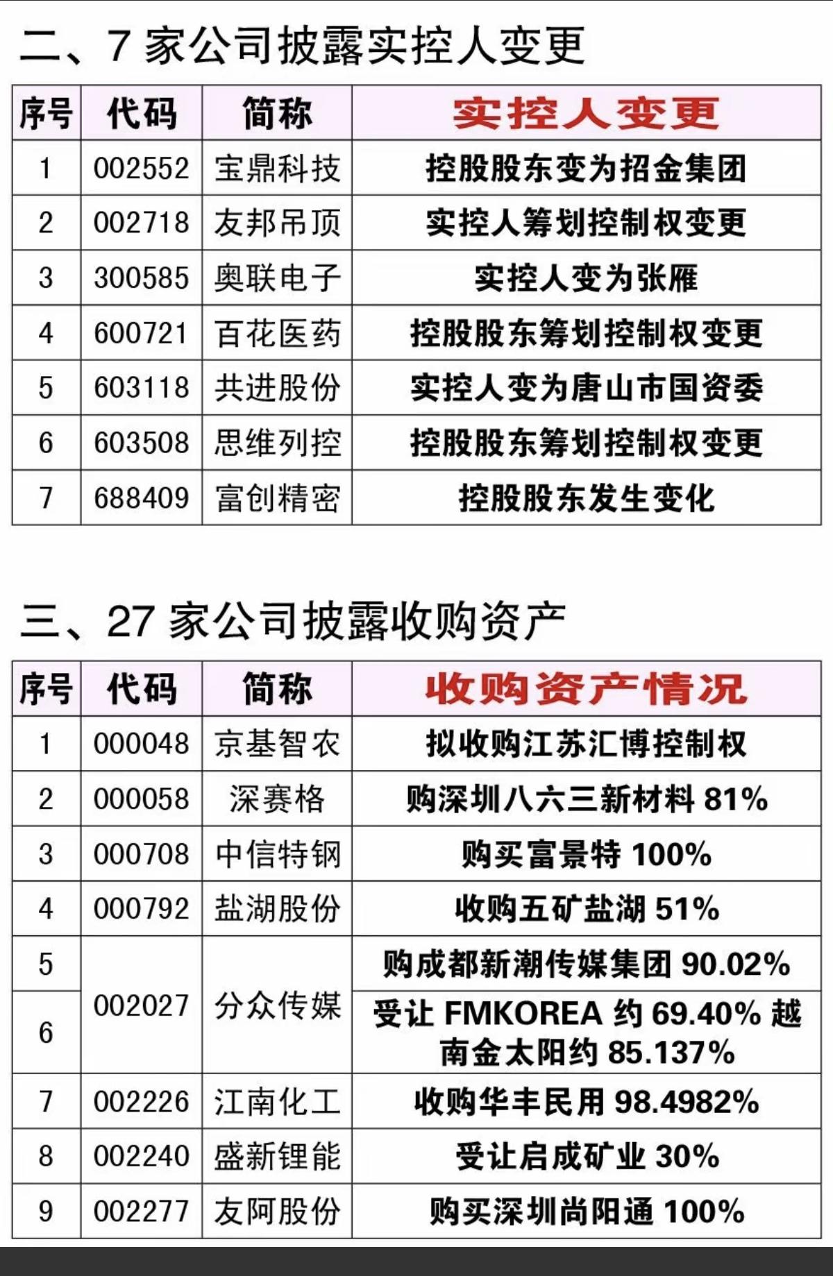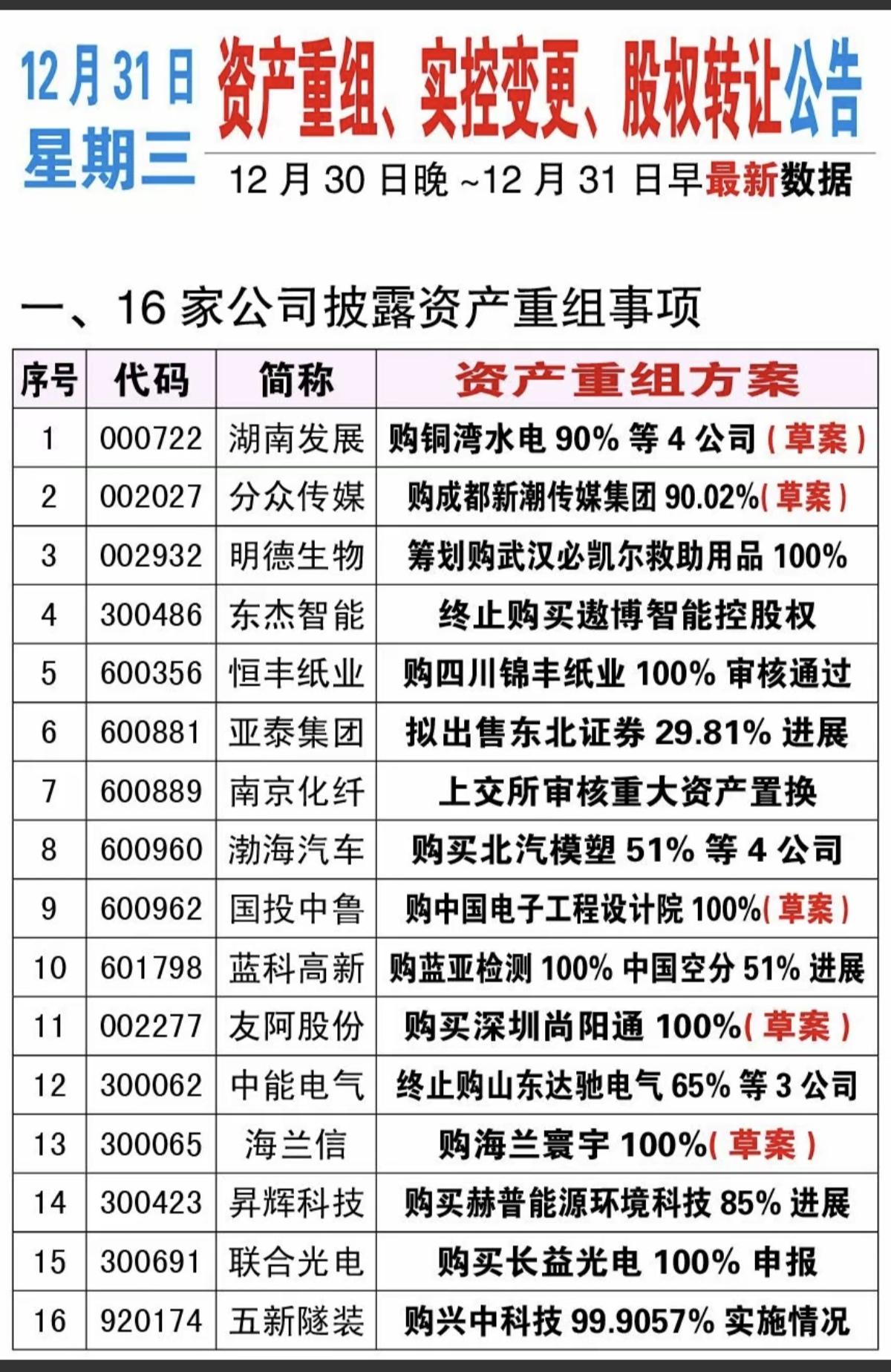 12.31周三最新:资产重组,实控人变更,股权转让公告! 16家资产重组,做大做强。7家实控人变更,27家公司披露收购资产,39家公司股权转让,8家公司出售资产,改善盈利。