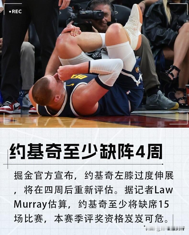 一伤毁一季!约基奇左膝遭遇过度伸展,将至少缺阵四周,掘金危险!!! 据ESPN名记Shams Charania报道,昨天在与热火的比赛中,约基奇遭遇队友误伤导致左膝过度伸展,将至少缺阵4周。 这一伤激起千层浪,本赛季的约老师可谓气吐山河、威风凛凛。出战32场比赛场均攻下29.6分12.2篮板11助攻1.4抢断0.8盖帽,是掘金最不可或缺的那个人。 如今这一伤很有可能年度最佳阵容没有了,还有可能就是球队战绩一落千丈,还有谁能够对抗雷霆。不过塞翁失马焉知非福,也许一切都是天意,伤好的约老师更加的生龙活虎。。。。