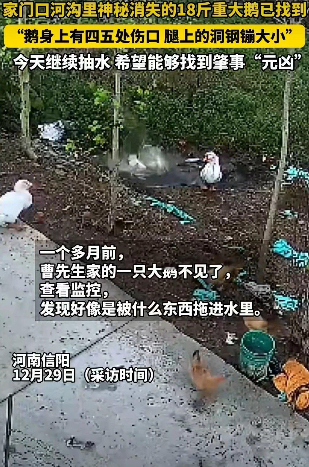 大鹅离奇死亡主人抽水追凶后续谁能想到!丢只大鹅居然惊动了挖掘机和抽水机!河南信阳曹先生家的18斤大鹅离奇失踪,紧接着村里大鹅接连不见,这事儿越想越蹊跷!查看监控只看到大鹅被拖进水里的模糊影子,任谁看了都得急上火。曹先生干脆狠下心,安排抽水机抽干水塘、叫挖掘机进场挖掘,果然在塘底找到了失踪的大鹅,可惜早已没了气息,浑身还带着伤。如今主人家还要继续抽水,势必要揪出这个肇事“元凶”。其实这事儿看着好笑,背后藏的都是普通人的较真劲儿。一只大鹅不值多少钱,但那是自家养的心头好,更是村里养殖户的一份小营生。大鹅接连失踪,换谁都不能忍气吞声。曹先生的做法看着“兴师动众”,实则是对自家财产的维护,也是对村里安宁的一份担当。生活里总有些糟心的小损失,有人选择忍了算了,有人偏要较真到底。这份较真不是小题大做,而是不纵容那些损害他人利益的行为。看似是为了几只大鹅,实则是守住生活里的一份理儿。为曹先生这份较真劲儿点赞!就该把这个“元凶”揪出来,给养殖户们一个交代!你们觉得水塘里藏着啥“元凶”?快来评论区大胆猜测!关注我,后续进展第一时间分享!如有侵权,请联系删除