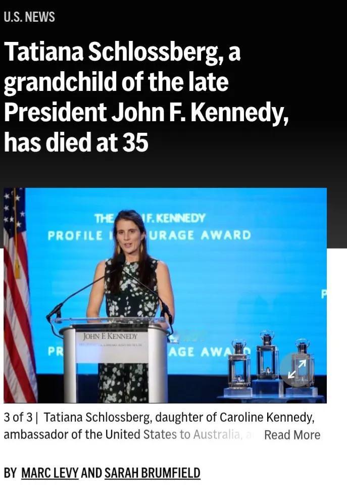 在美国肯尼迪家族英年早逝的人也不少。 据美媒报道称,环保记者塔蒂亚娜·施洛斯伯格是已故总统约翰·F·肯尼迪的三个孙辈之一,去年被诊断出患有白血病后去世。她享年35岁。 施洛斯伯格是肯尼迪女儿卡罗琳·肯尼迪和埃德温·施洛斯伯格的女儿,她在2025年11月《纽约客》的一篇文章中透露自己患有绝症癌症。约翰·F·肯尼迪图书馆基金会周二在社交媒体上发布了一份家属声明,披露了她的去世。 “我们美丽的塔蒂亚娜今天早上去世了。她将永远在我们心中,“声明中说。信中未透露死因或死亡地点。 施洛斯伯格讲述了2024年5月34岁时被诊断出急性骨髓性白血病的经历。在医院迎接第二个孩子出生时,医生注意到她的白细胞计数偏高。结果发现是急性骨髓性白血病,带有罕见突变,主要见于老年人。 在文章《与我的血液之战》中,施洛斯伯格回忆了经历了几轮化疗、两次干细胞移植以及参与临床试验的经历。她写道,在最近的一次试验中,她的医生告诉她“他可能能让我活一年。” 施洛斯伯格还批评了她母亲的表亲、卫生与公共服务部长罗伯特·F·肯尼迪(Robert F. Kennedy Jr.)推动的政策,称他支持的政策可能会伤害像她这样的癌症患者。她的母亲曾敦促参议员拒绝他的确认。 文章写道:“随着我越来越多时间在医生、护士和研究人员的照料下努力改善他人生活,我目睹鲍比为mRNA疫苗的研究削减了近五亿美元,这项技术本可用于治疗某些癌症。” 施洛斯伯格曾在《纽约时报》科学版担任气候变化和环境报道记者。她2019年的著作《不显眼的消费:你不知道自己拥有的环境影响》于2020年获得环境记者协会的瑞秋·卡森环境图书奖。 施洛斯伯格在《纽约客》的文章中写道,她担心女儿和儿子会记不得她。她感到被欺骗和悲伤,因为她无法继续与丈夫乔治·莫兰过上“美好的生活”。 虽然她的父母和两个兄弟姐妹试图对她隐瞒他们的痛苦,但她说她每天都能感受到这种痛苦。她的兄弟姐妹罗斯和杰克·施洛斯伯格是肯尼迪的另一位孙辈。 “我一生都在努力做好学生、好姐姐和好女儿,保护我的母亲,从不让她难过或生气,”她说。“现在我又给她的生活、我们家的生活添上了新的悲剧,而我无能为力。” 施洛斯伯格的母亲卡罗琳5岁时,她的父亲肯尼迪总统于1963年在达拉斯遇刺。1968年,她的叔叔罗伯特·F·肯尼迪在洛杉矶竞选总统时被暗杀,她10岁。 卡罗琳的哥哥约翰·F·肯尼迪二世于1999年在他驾驶的单引擎飞机坠入马萨诸塞州玛莎葡萄园附近的大西洋时去世。他的妻子卡罗琳和她的妹妹劳伦·贝塞特也在事故中遇难。