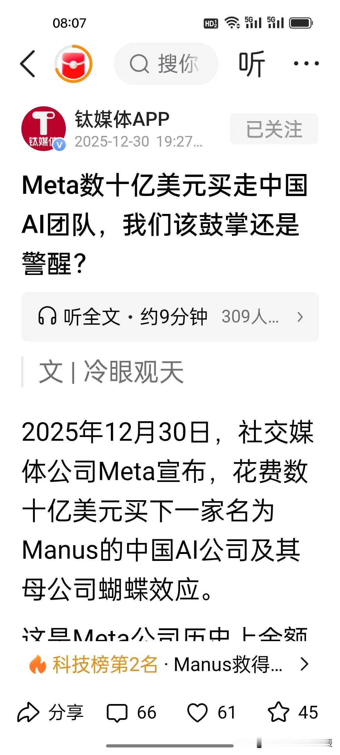 AI或许无界,但是中国科学家的家国心有界。一边是面对央视记者沈倩采访,满含热泪说“回国是光荣”的在美国28年已经功成名就而放弃美国优渥生活毅然回国的人工智能专家朱松纯,一边是被扎克伯克的Meta公司第三笔巨额收购,花了10亿美金(也有说法是40亿美金)收购的中国两个小伙子创建的AI智能体公司Manus,这是全球第一个通用型AI智能体,创始人肖弘直接成了Meta的副总裁,瞬间财富自由。 再看梁文锋扎根本土,让DeepSeek模型比肩国际顶尖水平,拿了美国《自然》年度十大科学人物,还入选《时代》全球最具影响力100人,虽然有股民说他的幻方量化割韭菜,但是梁文锋的deepseek不接受国外资本投资,也不主动融资,公司也没有复杂的海外股权架构,这一对比,高下立判。 AI技术或许无界,但研发者的家国心有界。国内需加大政策面,算力、资金扶持AI创新企业,更要建立精准技术审查机制,守住核心创新不外流的底线。当科技报国成为共识,才能让中国AI的未来牢牢攥在自己人手里!