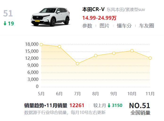 2025年5月,本田CR-V销量17987辆; 2025年6月,本田CR-V销量17164辆; 2025年7月,本田CR-V销量9873辆; 2025年8月,本田CR-V销量13277辆; 2025年9月,本田CR-V销量14345辆; 2025年10月,本田CR-V销量15411辆; 2025年11月,本田CR-V销量12261辆。   1995年,第一代本田CR-V上市,2025年,是本田CR-V 30岁生日,在而立之年,本田交出了一份满意的答案,30年累计卖出1500万辆。   2025年9月22日,本田CR-V正式推出全球30年荣耀款,升级不加价,起售价下探至14.59万元,并辅以金融免息、置换补贴等高达2.4万元的礼遇。这款极具诚意的纪念版车型的上市,有效刺激了消费需求,是拉动8、9、10月销量三连升的核心动力。   面对自主品牌新能源车型与其他合资竞品的多重夹击,CR-V即便产品力升级,也难免受到市场大盘波动的影响。   那么,大家对本田CR-V怎么看?评论区聊一聊。