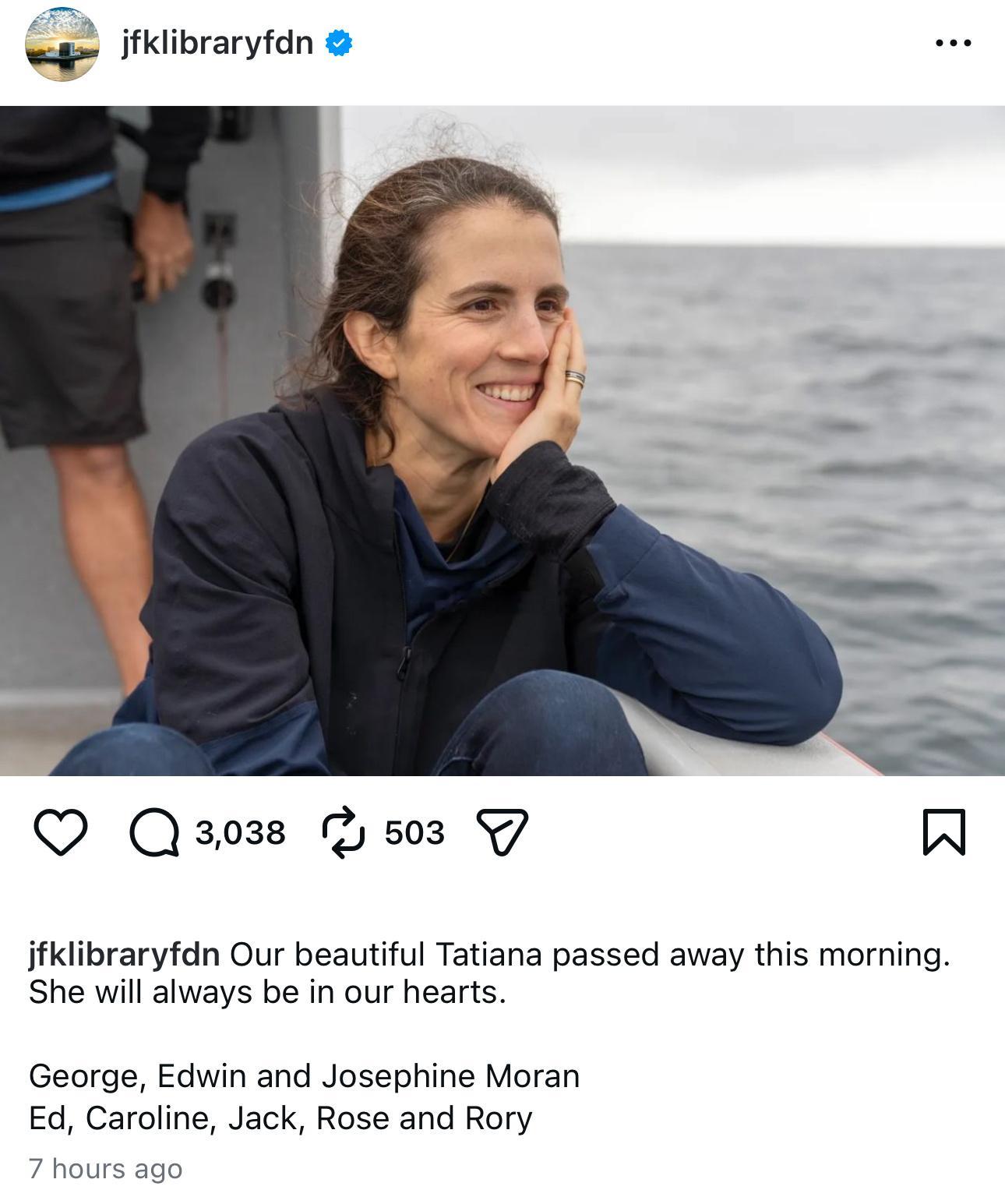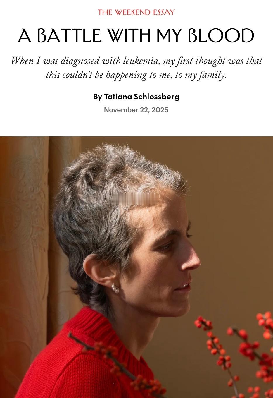 肯尼迪家族的成员,Tatiana Schlossberg,已故总统JKF(约翰·肯尼迪)的外孙女,因为罹患急性髓系白血病去世了,年仅35岁。她的妈妈Caroline是JKF和Jacqueline四个孩子里唯一在世的一位。Tatiana在11月22日《纽约客》的一篇文章中自述(图二),她在2024年5月生下跟丈夫的第二个孩子之后,被诊断出罹患了伴有一种罕见基因突变的急性髓系白血病,这是一种血液和骨髓癌症,只剩下不到一年的寿命。她当时在文章的最后这么写道👇“大多数时候,我只是尽量活在当下,和孩子们待在一起。但活在当下其实比听起来要难得多,所以我任由记忆来来去去。许多记忆都来自我的童年,让我仿佛一边看着小时候的自己长大,一边看着我的孩子长大。有时我会骗自己说,我会永远记得这些,即使死了也会记得。当然,那是不可能的。可是我既不知道死亡是什么样子,也没有人能告诉我死之后会发生什么,所以就继续装作会记得吧。我会努力记住的。”(图三:她跟老公2017年结婚时的合照)(图四:她生病后在父母纽约家中所拍)