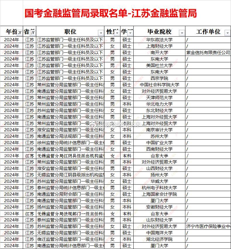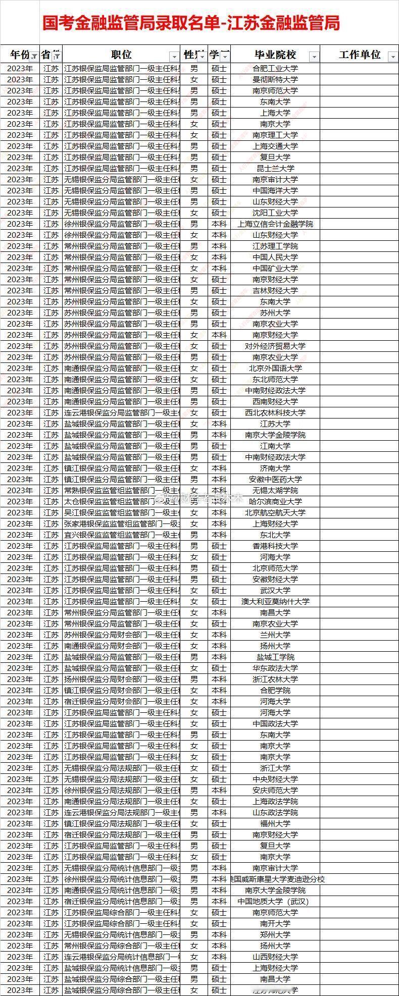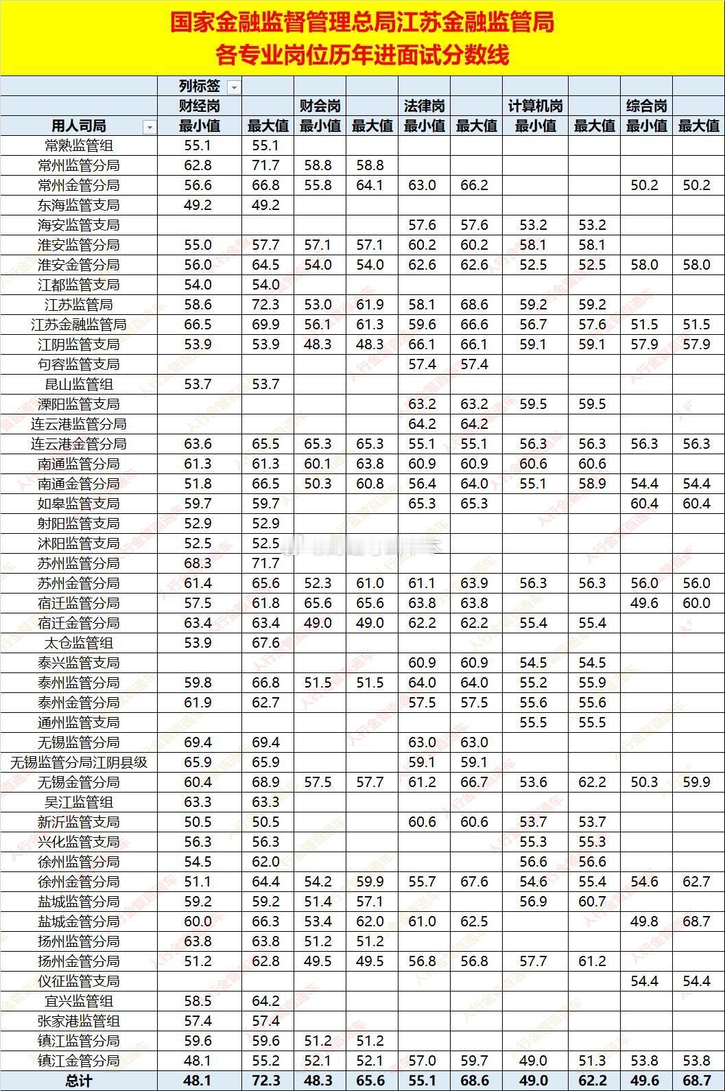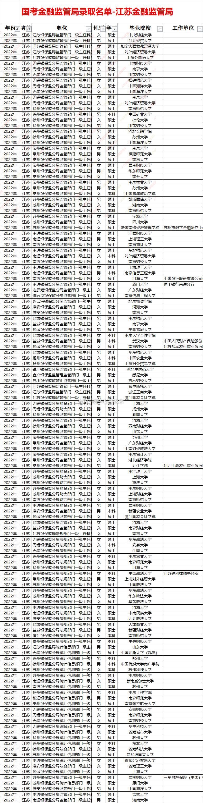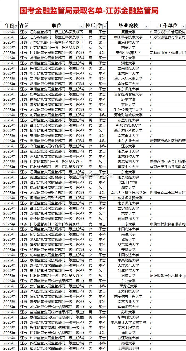 国考金管局江苏金监局录取名单面试进面分数线一、录取情况汇总人数与性别2021-2025 年江苏金管局共录取约 213 人:2021 年 28 人、2022 年 65 人、2023 年 50 人、2024 年 30 人、2025 年 40 人。性别上女生占比偏高,女男比例约 3:2。高校层次超 70% 录取者来自双一流院校(如复旦、南大、中科大等),仅约 15% 为普通本科(如济宁学院、河北金融学院)。工作单位超 80% 为应届生(无工作单位),少数来自金融机构(如中信银行)或基层单位(如新疆乡镇)。二、岗位分数线区间趋势财经岗:进面分 48.1-72.3,高值近年小幅上升;财会岗:48.3-65.6,区间整体稳定;法律岗:55.1-68.6,高值呈缓慢上涨趋势;计算机岗:49.0-62.2,区间窄且波动小;综合岗:49.6-68.7,高值波动较大(如 2025 年达 68.7)。金监局考试 金监局面试 金管局面试 金融监管局面试