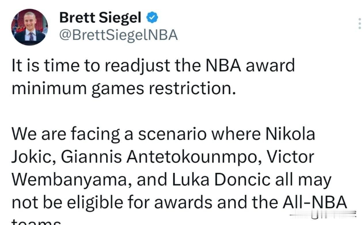 合理吗?约基奇受伤名记建议NBA修改评奖规则! 今天,掘金队官方公布了约基奇的最新伤病情况,万幸的是他并没有遭遇韧带组织伤病,只是遭遇了左膝过度伸展,仍然需要缺席至少四周的比赛。这样一来,约基奇极有可能因出战场次不够而无缘MVP、最佳阵容的评选,在此之前,约基奇被视为本赛季MVP的最有力争夺者,最佳阵容一阵也是板上钉钉的事情。 随着约基奇受伤,知名记者Brett Siegel发文喊话联盟,希望对NBA赛季评奖规则里的最低出战场次进行调整,不然本赛季有很多超级巨星都无法参与评奖。 根据数据统计,本赛季至今,文班亚马缺席了12场比赛,字母哥缺席了14场比赛,东契奇缺席了7场比赛,而约基奇至少将缺席18场比赛,这些球员都有可能因出战场次未达到65场而失去MVP、最佳阵容的评选资格。 对于记者Brett Siegel的建议,舆论也分成了两块。有人认为出勤率是评选奖项的重要指标,如果连最基本的出战65场比赛都达不到,那失去评奖资格是理所当然的事情,不然对那些出勤率高的球星不公平;也有人认为联盟确实需要降低评奖出战场地,因为现在比赛节奏太快,核心球员大包大揽确实容易受伤,规则也应随之改变。对于这个情况,你有何看法?