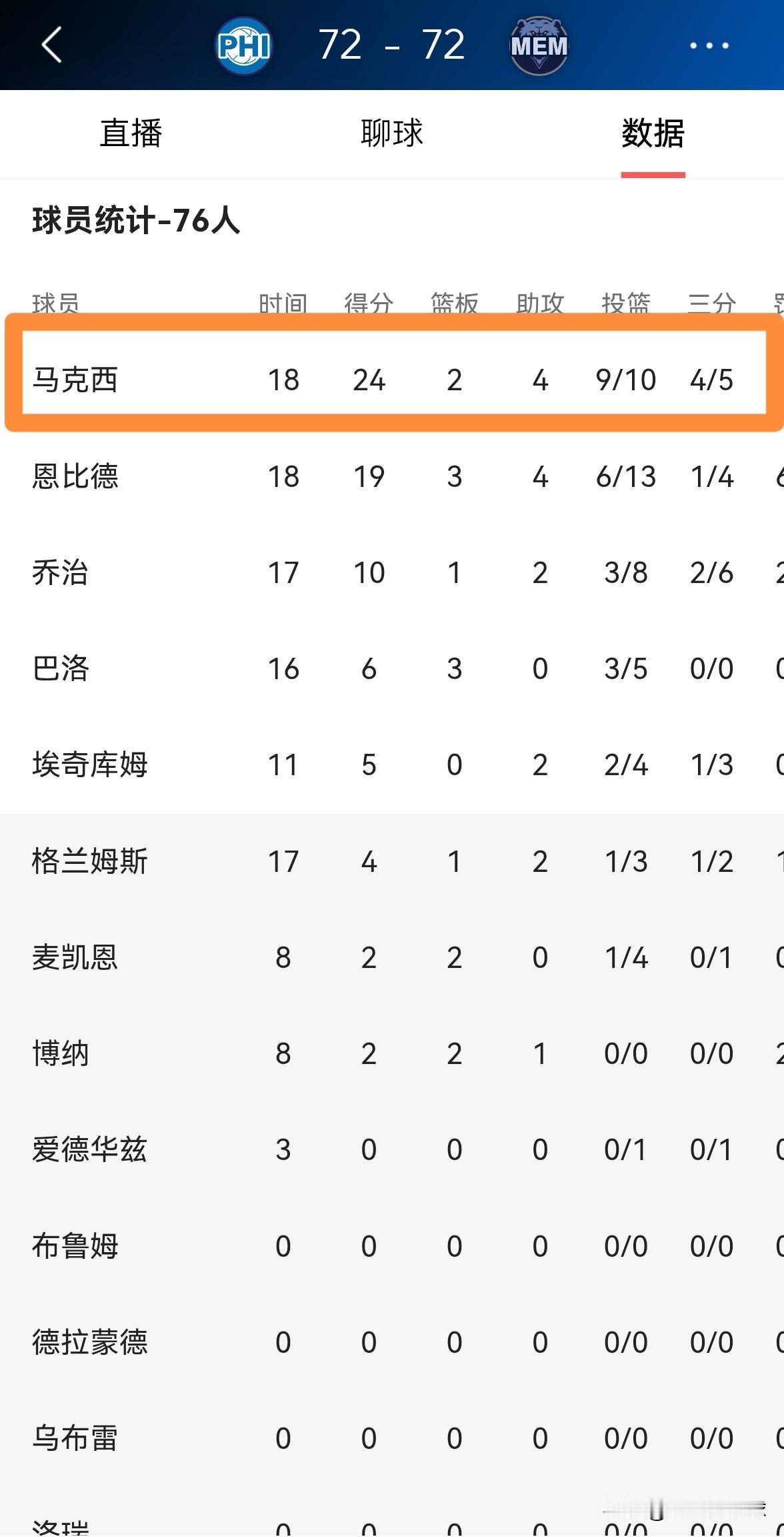 我忍不住要怒赞76人超级后卫马克西!在今天76人客场挑战灰熊的上半场比赛中,马克西打出了极其说服力的表现。在前两节比赛中,马克西首发出战18分钟,投篮10中9,其中三分球5中4、罚球2中2爆砍24分2篮板4助攻2抢断,没有出现任何的失误。 值得注意的是,在第二节比赛的最后时刻,马克西迎着灰熊球员的防守投进了一记让人叹为观止的压哨三分,帮助球队扳平了比分。