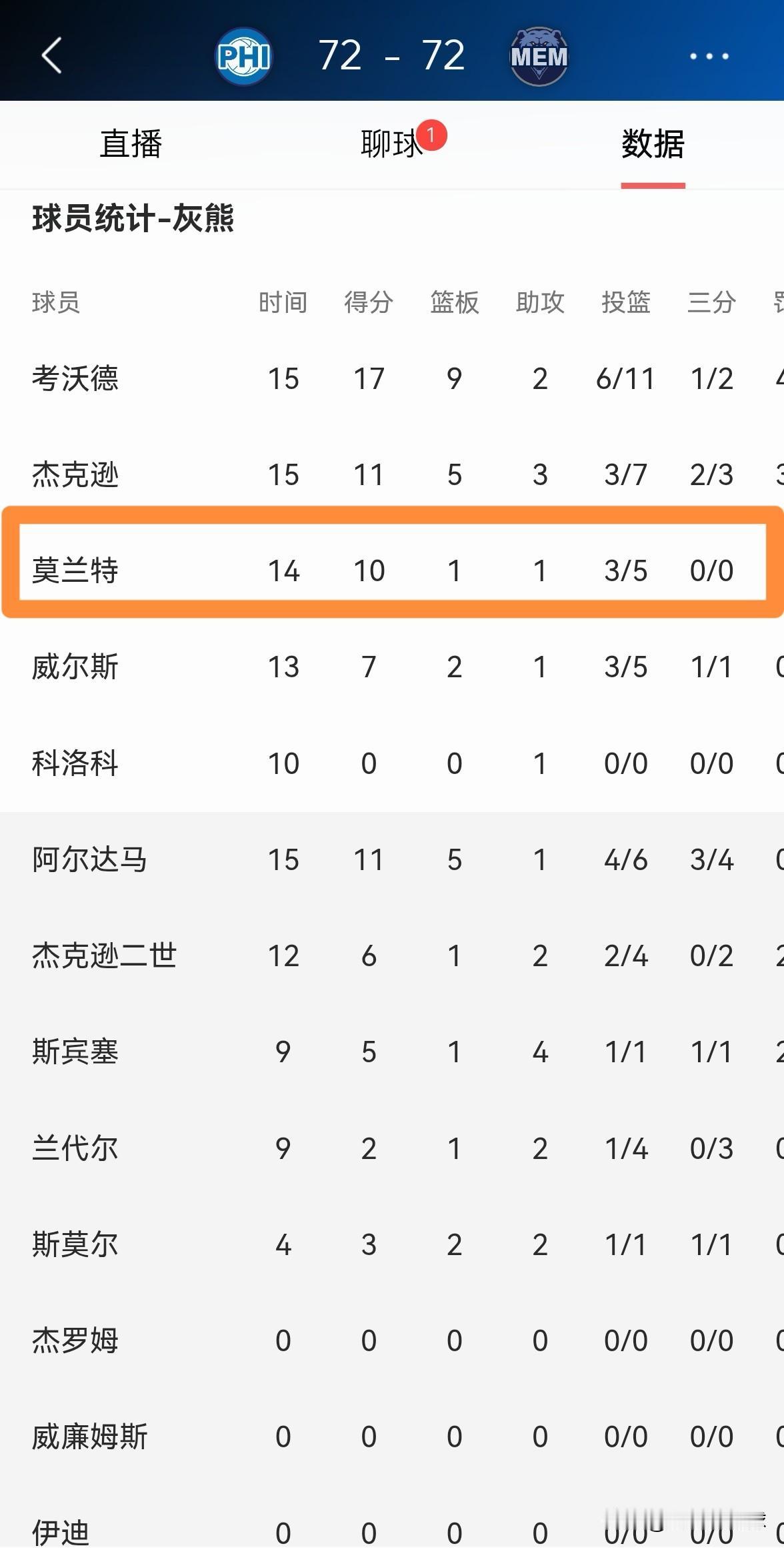 灰熊当家球星莫兰特打球越来越合理了!在今天灰熊主场迎战76人的比赛中,目前双方的上半场比赛已经结束,两支球队战成了72平。在前两节比赛中,莫兰特首发出战14分钟,投篮5中3,其中罚球6中4得到10分,还有1篮板1助攻1抢断。 如今莫兰特在打球方式方面有了非常大的提高,他几乎不会出手自己不擅长的三分球,他的进攻选择变得越来越合理了,这对于灰熊来说绝对是一件大好事。