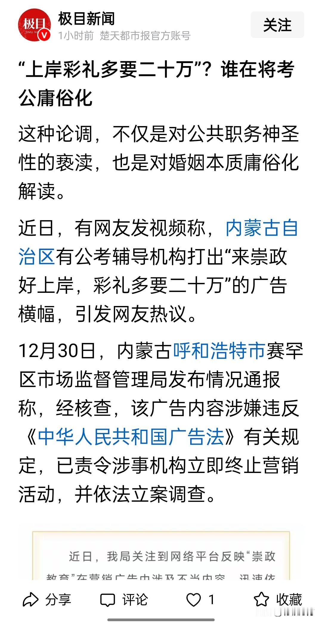 有公考辅导机构打出广告,说“来崇政好上岸,彩礼多要二十万”,现已被终止营销并立案调查。 制止这种传播封建腐朽价值观的营销活动只是第一步,更要把其中观念的错误说清说透。 封建王朝为了拢络社会精英为其服务,说什么“书中自有千钟栗,书中自有黄金屋”,这就是纯粹的诱之以利,完全没有价值追求。但是时间进入现代以后,人的观念也应该有所改变,各个行业都是为社会做贡献,没有三六九等,“上岸”也是为了更好的服务社会,怎么能这么赤裸裸地讲利益?这种思想指导之下的机构恐怕也辅导不出什么优秀的人才。