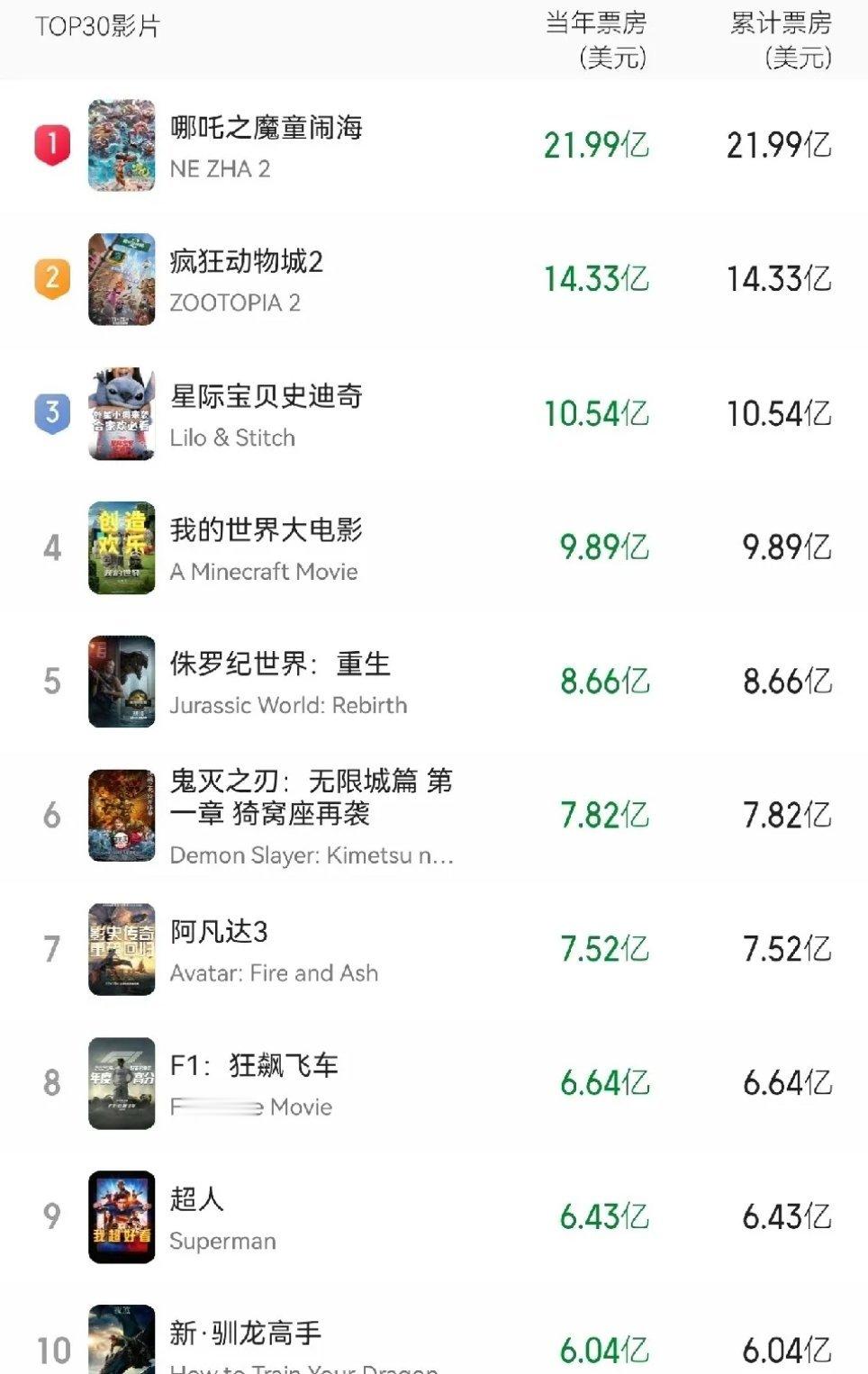 2025年全球电影票房十强1.哪吒之魔童闹海,全球累计票房21.99亿美元,国产动画电影,饺子导演,国内首部票房突破百亿元的电影,打破了太多的票房记录;2.疯狂动物城2,好莱坞动画电影,全球累计票房14.33亿美元,其中内地票房5.65亿美元,还在上映中;3.星际宝贝史迪奇,全球累计票房10.54亿美元;4.我的世界大电影,全球累计票房9.89亿美元;5.侏罗纪世界重生,全球累计票房8.66亿美元;6.鬼灭之刃:无限城篇,日本动画电影,全球累计票房7.82亿美元;7.阿凡达3,全球累计票房7.83亿美元,还在上映中,票房持续走高;8.F1:狂飙飞车,全球累计票房6.64亿美元;9.超人,全球累计票房6.43亿美元;10.新驯龙高手,全球累计票房6.04亿美元。
