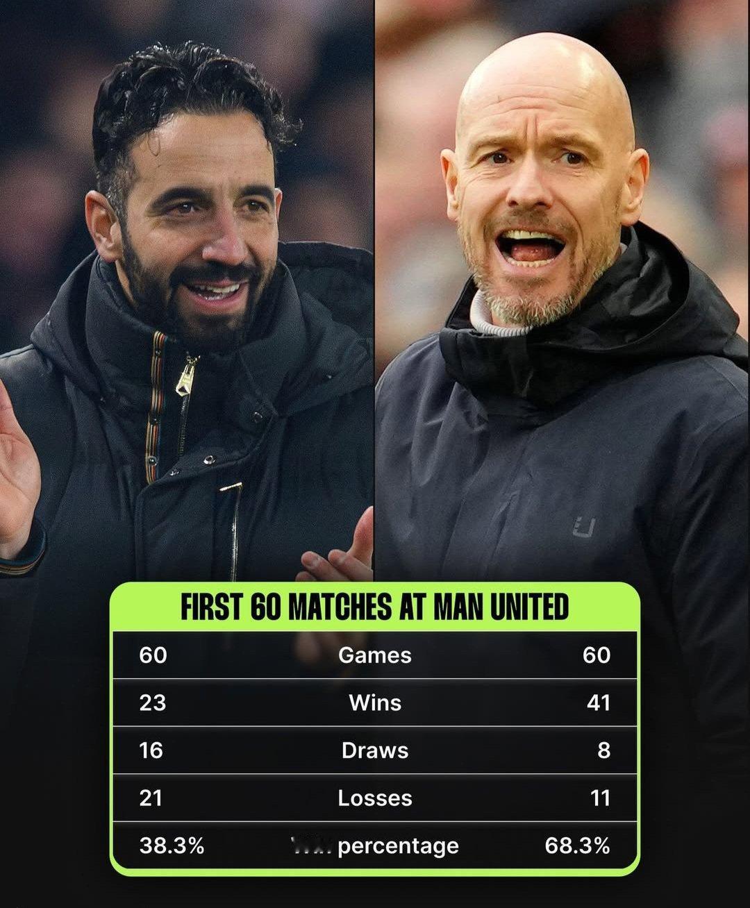 差距也太大了!阿莫林和滕哈格执教曼联前60场比赛的成绩对比👇: 阿莫林23胜16平21负,胜率38%🤔 滕哈格41胜8平11负,胜率68%😳 曼联