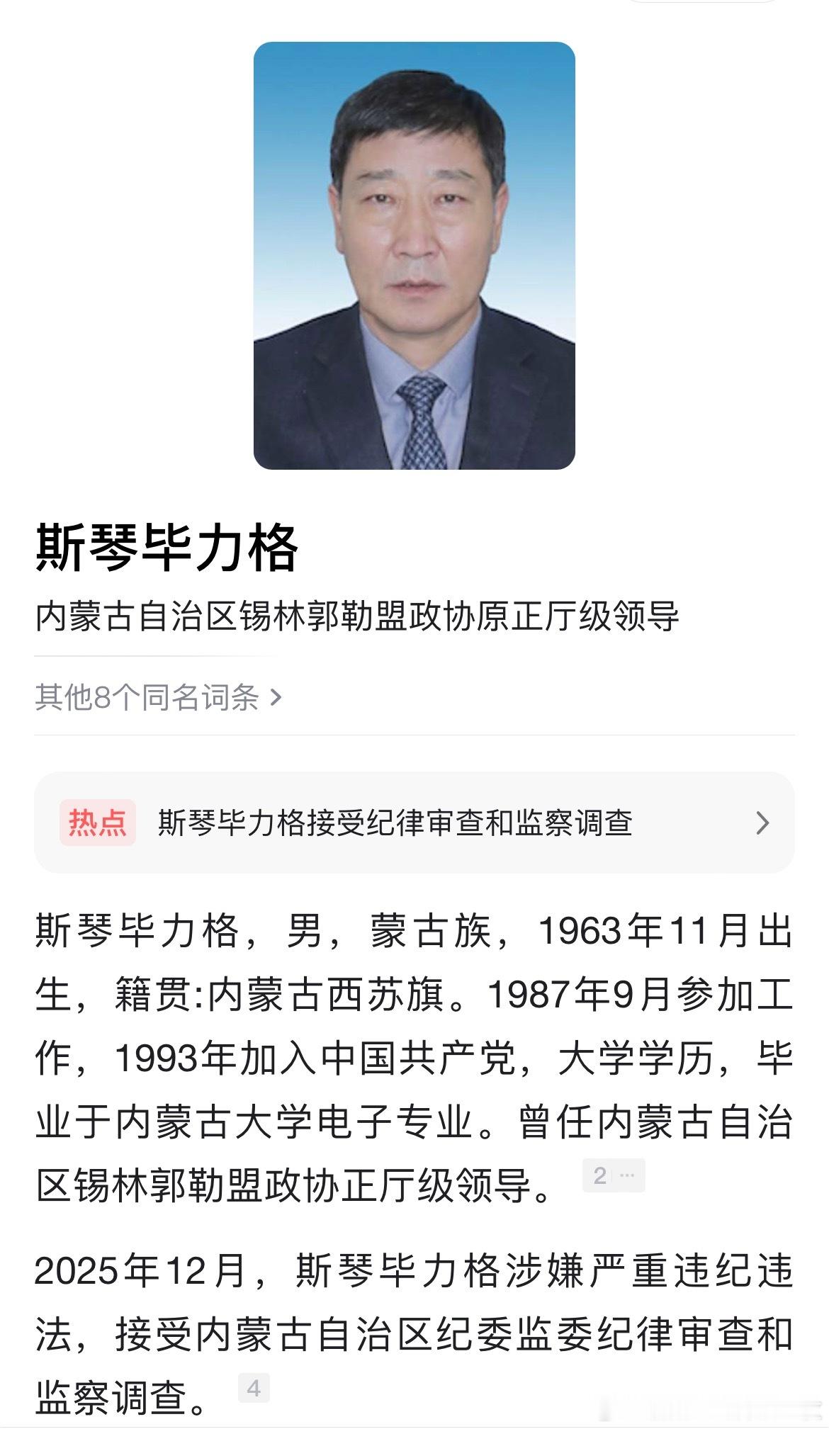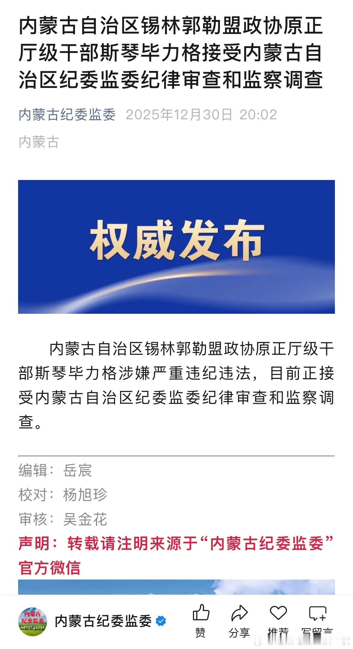 内蒙古自治区锡林郭勒盟政协原正厅级干部斯琴毕力格接受内蒙古自治区纪委监委纪律审查和监察调查。