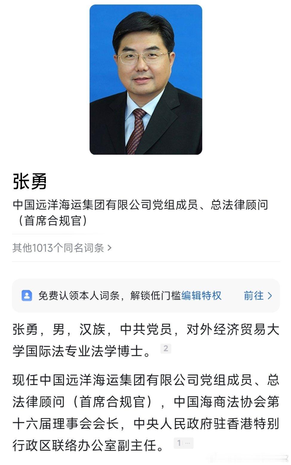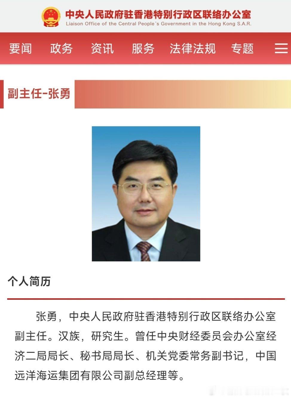 张勇任中央人民政府驻香港特别行政区联络办公室副主任。