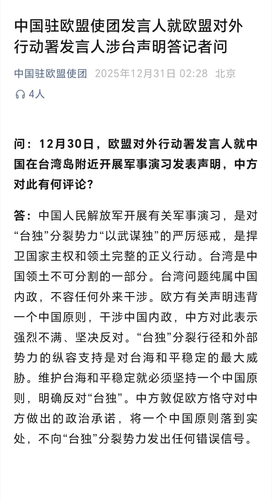 中方回应欧盟涉台声明中国驻欧盟使团发言人:台湾问题纯属中国内政,不容任何外来干涉。欧方有关声明违背一个中国原则,干涉中国内政