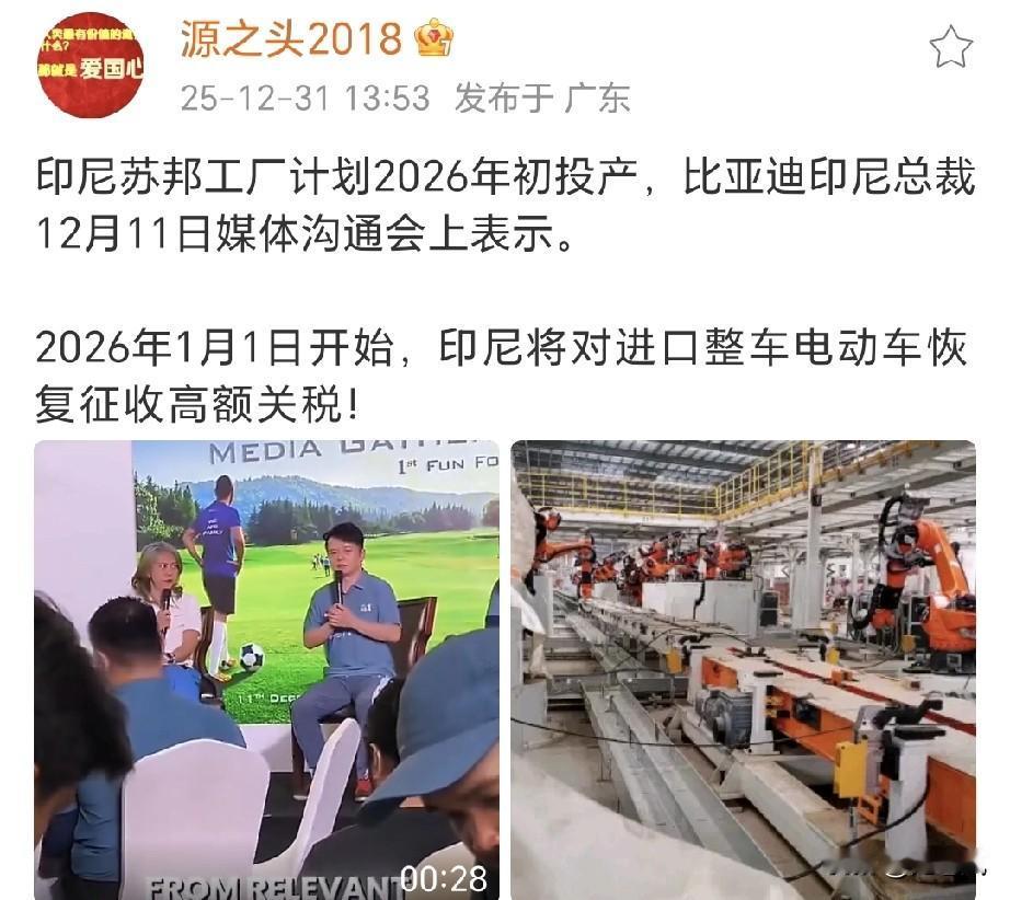 比亚迪印尼工厂明年初投产。 然后印尼要恢复电动车高昂关税。 这样对比亚迪算是个利好了,不用在印尼也开卷了。 泰国是已经卷的不行了[笑哭]比亚迪海外发展 比亚迪海外战略 比亚迪泰国销量