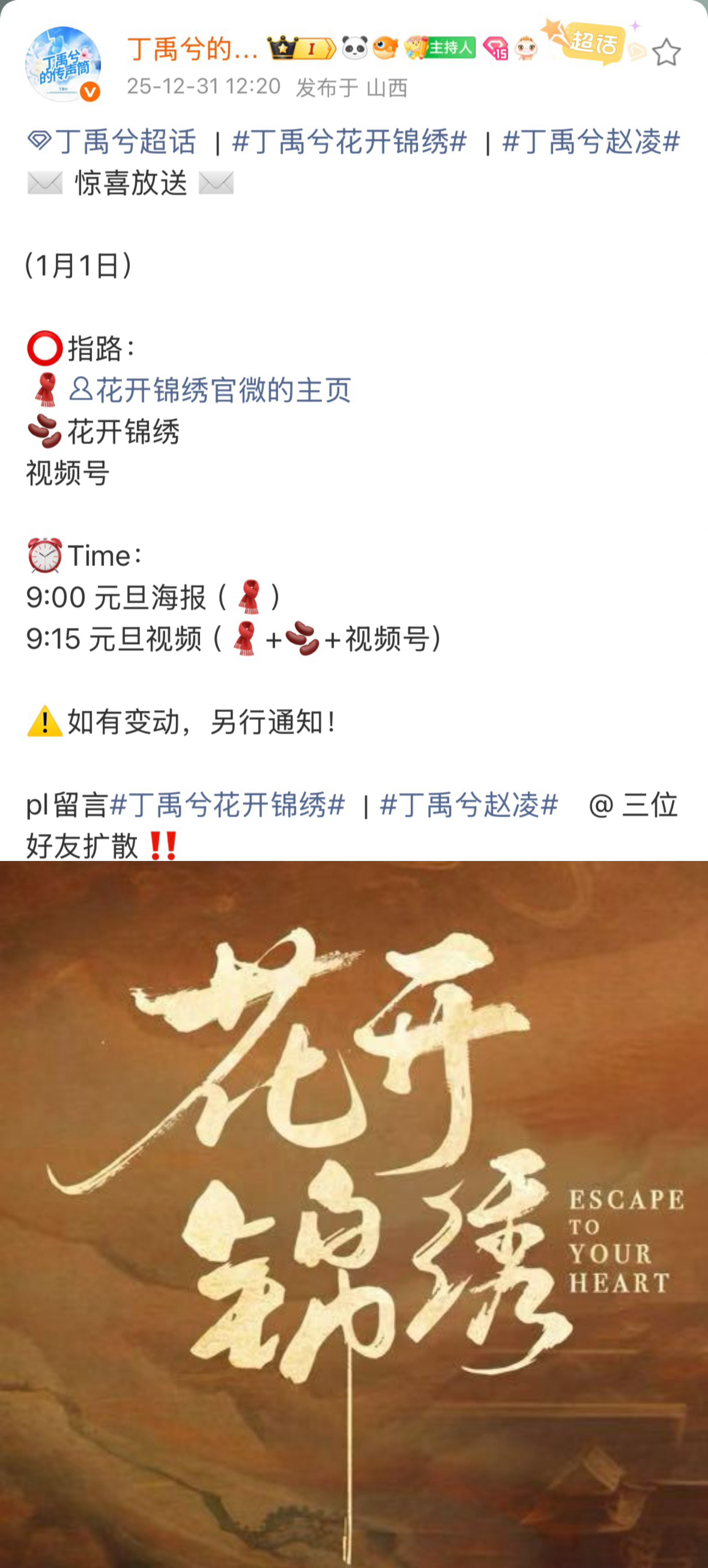 花开锦绣元旦惊喜放送丁禹兮花开锦绣元旦即将发布新鲜物料,又可以看新鲜的赵凌啦,燥候