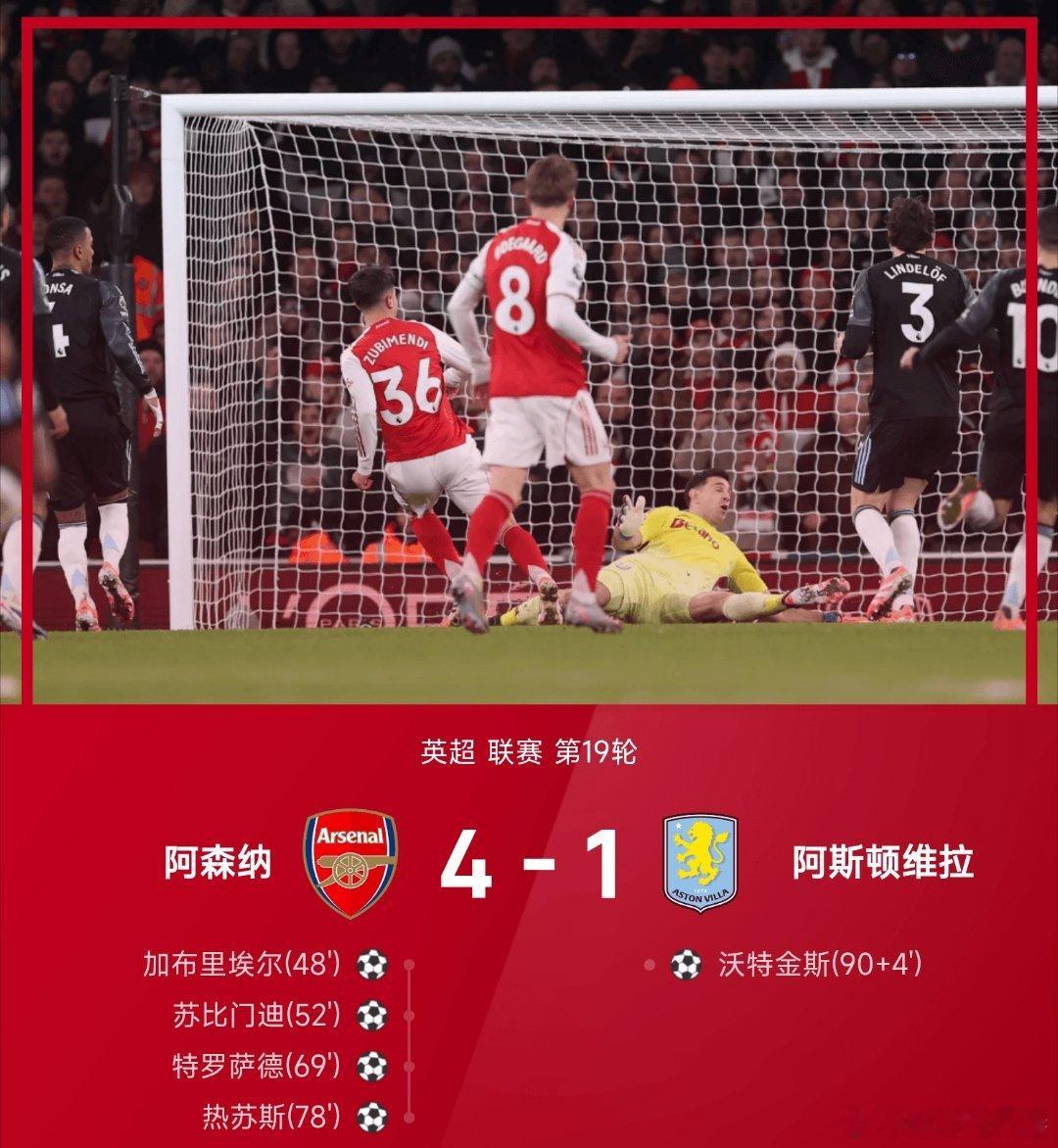 阿森纳4比1阿斯顿维拉英超每日足球推荐 阿森纳4-1战胜阿斯顿维拉。上半场,两队均无建树;下半场,大马丁扑救失误、加布里埃尔为阿森纳打破僵局,苏比门迪建功扩大领先优势,随后特罗萨德完成传射,热苏斯替补登场锁定胜局,补时阶段,沃特金斯为维拉扳回1球,最终阿森纳4-1取胜,维拉各条战线11连胜被终结。