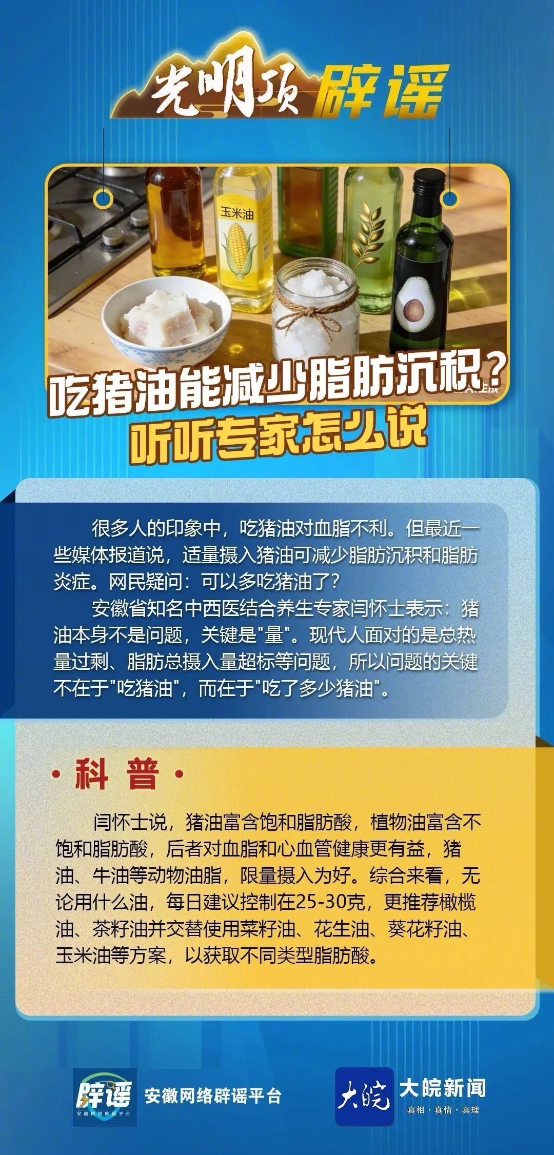 【#光明顶辟谣#丨动物油脂还是植物油脂更健康?听听专家怎么说】#营养专家说猪油替代植物油不可取# 最近,有网民发布植物油和动物油脂哪个更健康的帖子引发关注,相关话题登上热搜,部分网民提出 “用猪油替代植物油以改善血脂”的建议。安徽省知名中西医结合养生专家闫怀士表示,从现代营养学和预防慢性病的角度来看,这种做法是不可取的,甚至可能带来健康风险。 “对于已经持续很久的动物油脂还是植物油脂更健康的争论,是一个典型的将复杂问题简单化、非黑即白的认知误区。”网页链接