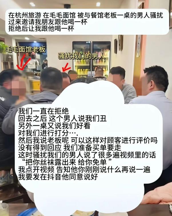 杭州文旅彻底慌了,毛毛面馆的老板一句话让文旅10年白干。 女子在面馆吃饭,因穿丝袜被一桌男食客调戏,叫她去陪酒。老板儿子不仅没制止,还添乱说“露出丝袜就免单”。这事一爆,杭州文明形象差点塌方。 但杭州政府反应超快,警方立刻调查,调戏者被拘十天。别因为个别人渣就否定整座城,哪个地方没几个败类?关键得看处理速度——不护短、敢担当,这才是城市的底气。 咱游客也多留个心眼,遇事别忍,报警没商量。杭州还是那个西湖美景的杭州,可不能让几颗老鼠屎坏了汤。