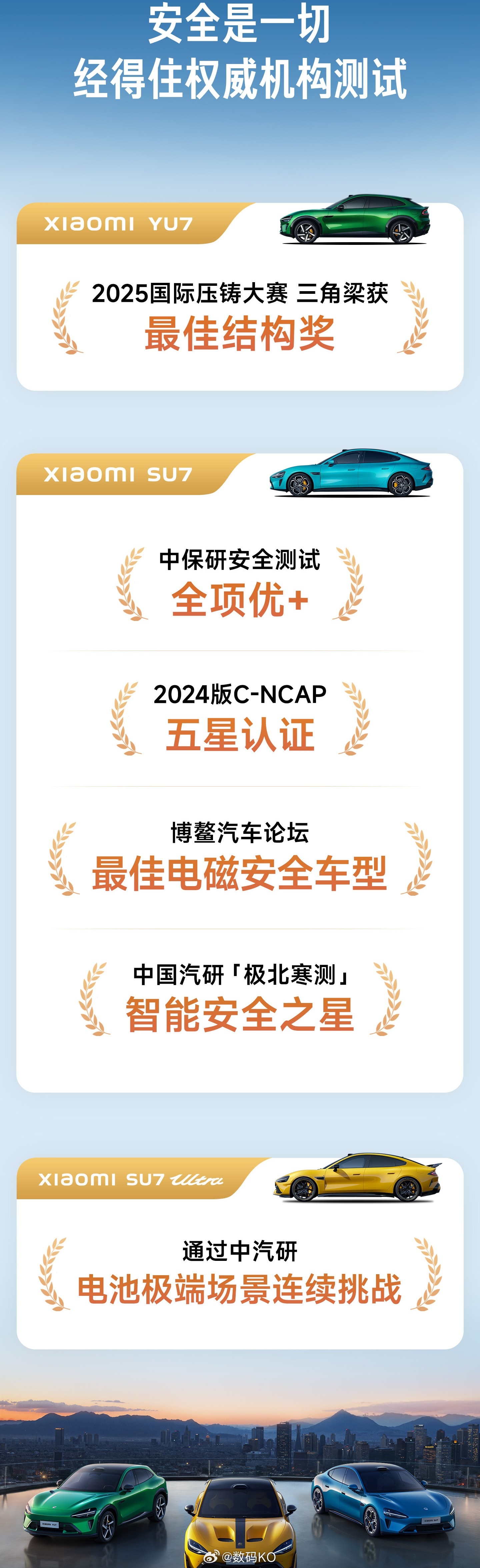 完全是一切,经得住权威机构测试小米YU7:2025国际压铸大赛三角梁最佳结构奖小米SU7:1. 中保研安全测试全项优+2. 2024版C-NCAP五星认证3. 博鳌汽车论坛最佳电磁安全车型4. 中国汽研「极北寒测」智能安全之星小米SU7 Ultra:通过中汽研电池极端场景连续挑战