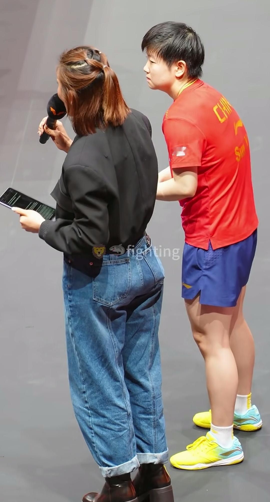 主持人还在讲话,莎莎就弯腰前倾的转头看着主持人。感觉莎莎是真的累了。 主持人一句话,莎莎转了三次头,第二次就不由自主的弯腰了。 12月份赛程太密集了,两场比赛只间隔了80分钟。纯走路都受不了,何况在场上跑来跑去的。 莎莎,接下来,好好休息吧。