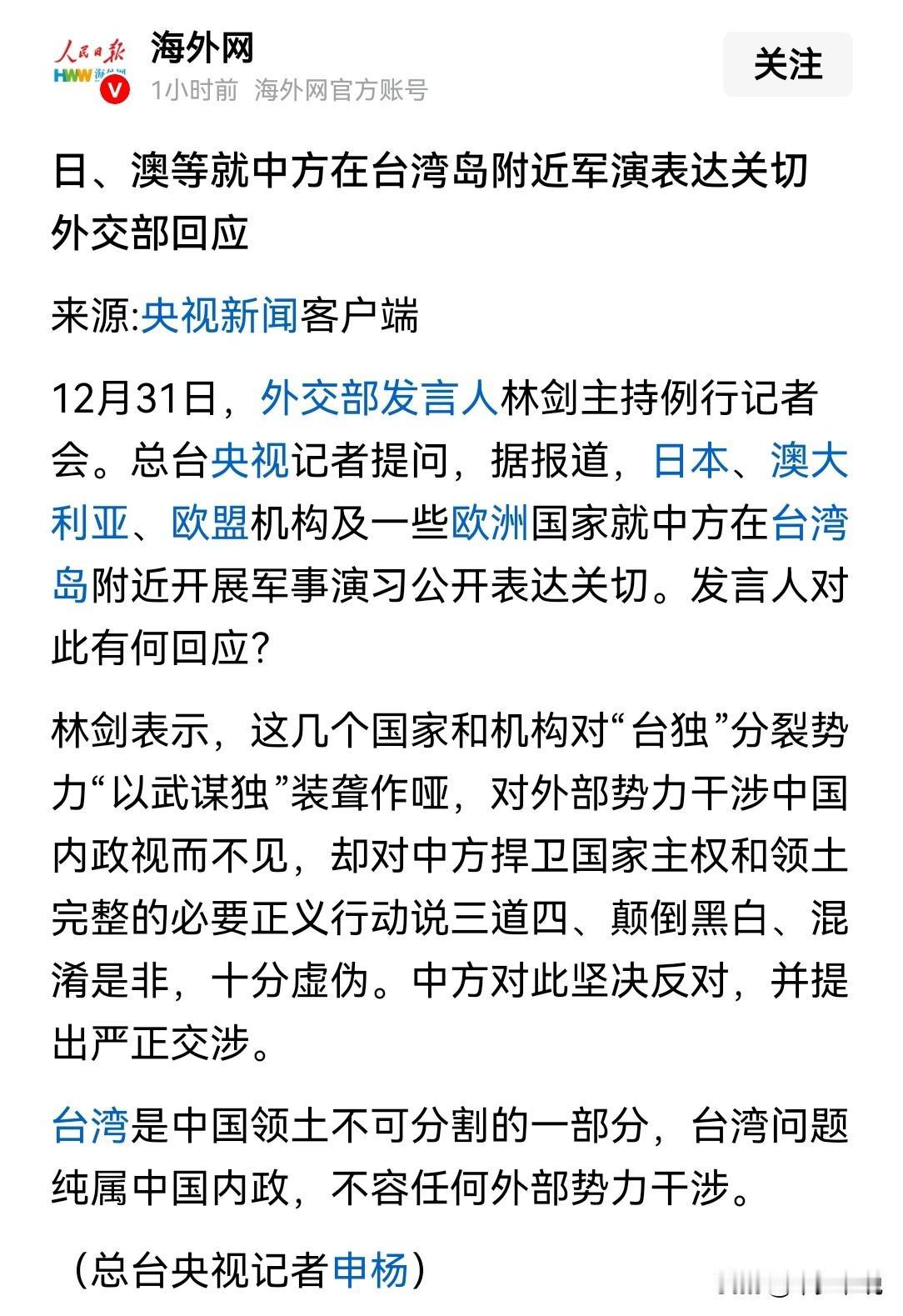 外交部点名日本和澳大利亚“说三道四、颠倒黑白” 今天外交部记者会上有记者提问“日本和澳大利亚对中国围台军演表示“关切”” 外交部发言人以“说三道四、颠倒黑白、混淆是非”来点名日本和澳大利亚,并且用“十分虚伪”来加以形容。 日本和澳大利亚一直以来都充当西方反华的马前卒,对中国内政以及台湾问题指手画脚,中国此次点名日本和澳大利亚就说明两国的所谓“关切”已经触及中国底线。