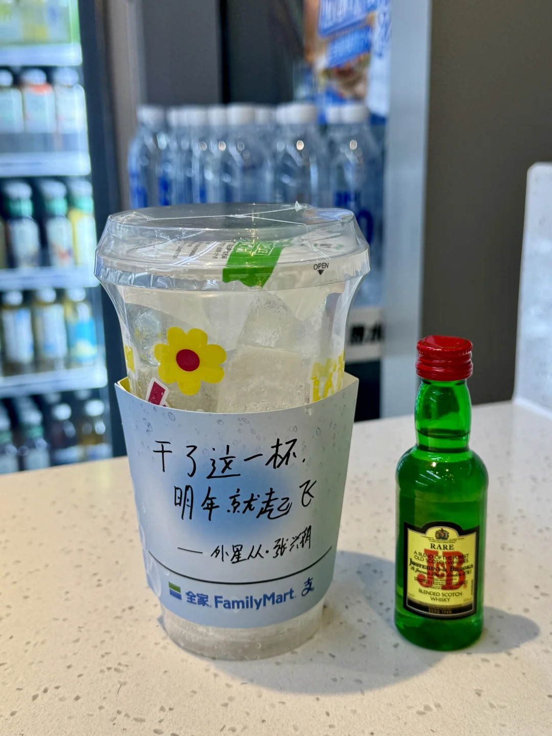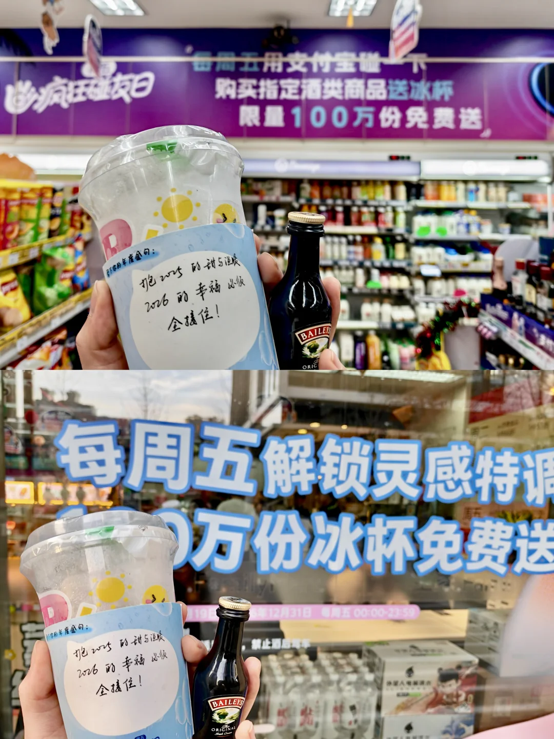 🌈上周五下班照旧是全家囤货日,拿好了酒跟饮料打算回去自调,店员说要不要支付宝碰一下付钱,用碰一下买这款酒免费送冰杯,每周五都有活动。支付宝这小子真是懂打工人哈,外星从手写文案杯套也安排上了,杯套空白处还能写下自己的跨年心愿,仪式感拉满~