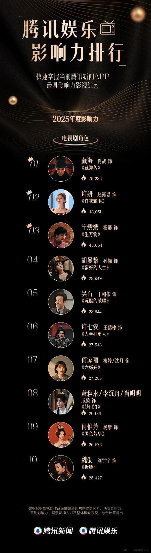 腾讯娱乐2025年度影响力电视剧角色前十,优酷剧的主角肖战(藏海)拿下了第一