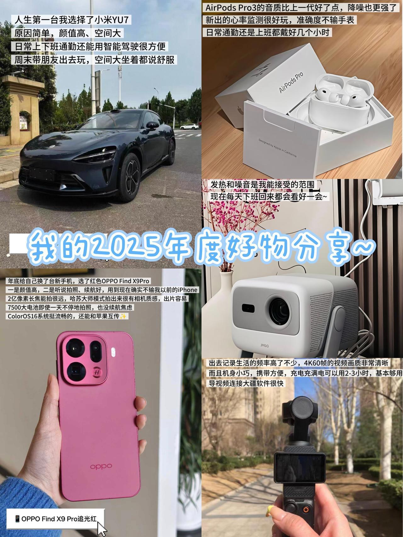 自用分享丨2025年买后很上头的几款产品✨ 没想到2025年这么快咻的一下就过去了 是时候给做个年度总结了 25年我搬了家、买了挺多东西的 新手机、新耳机还有新车🚗 这些都是我自己在用的 坑踩多了才选出这么几款好用的📝 现在年底了,为了犒劳忙忙碌碌一整年的自己 你们会买什么好东西奖励自己呢? - 我的年度爱用分享 年度好物推荐 OPPOFindX9Pro 小米yu7 AirPodsPro3 好物分享 2025总结 投影仪 大疆pocket3