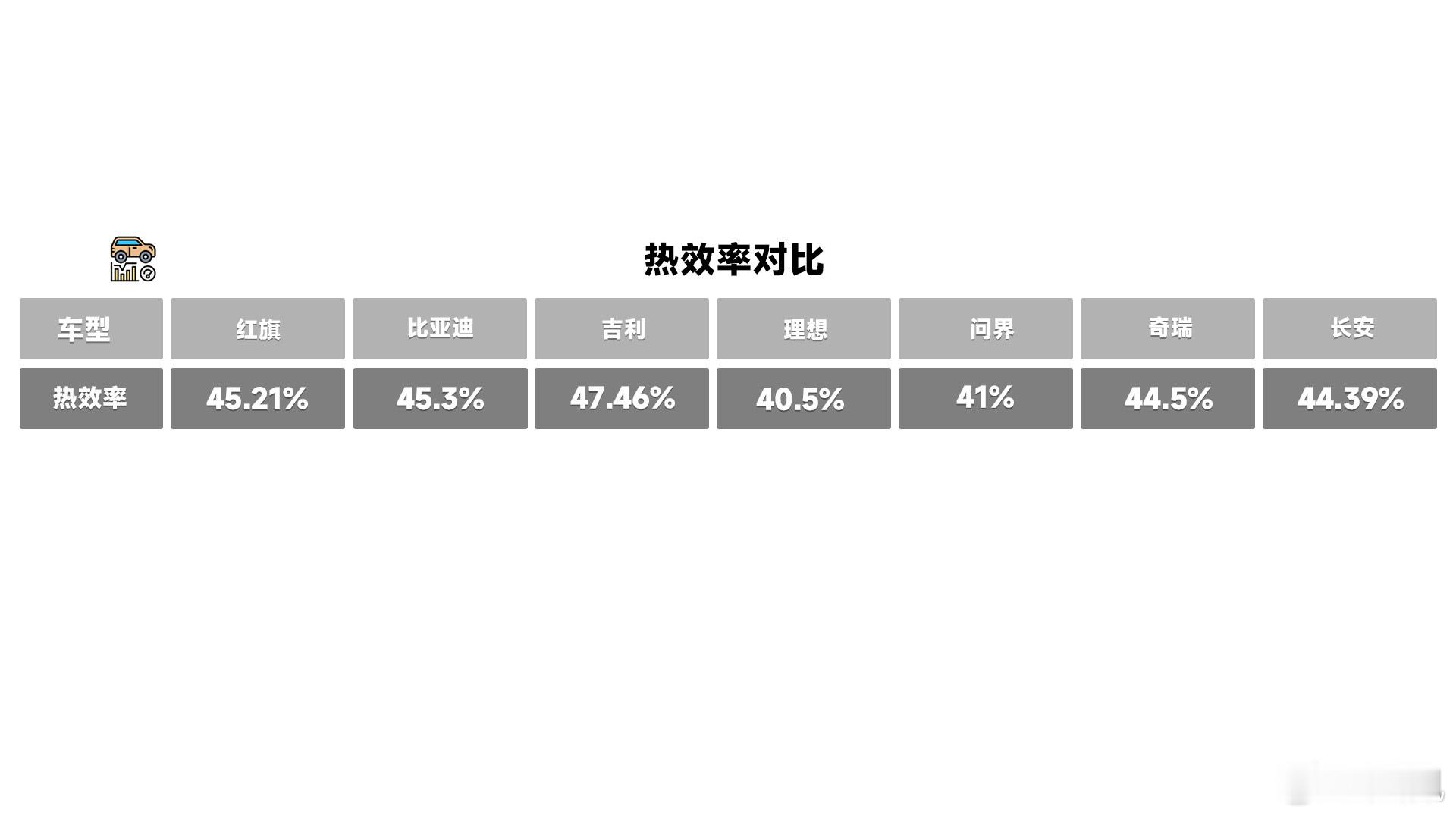 为什么零跑也相中了红旗的发动机?拿最近我拆过的红旗HS6 PHEV的1.5T混动专用发动机来说几句:1. 高压缩比13.5:1 、深度米勒循环、废气再循环系统、全MAP智能热管理、全MAP 可变机油泵、活塞自定位技术等等提升燃油效率的技术都用到了,还有集成式进气歧管和分离式排气增压两项红旗自研的技术。2.这副发动机的热效率达到45.21%,我整理了几家车企的发动机热效率数据,红旗这副机器排第三。3. 红旗HS6 PHEV搭载这副发动机能把匮电油耗做到最低5.1L/100km,四驱版本匮电油耗也不超过6L/100km,要比同级车型更省油一些。要拼发动机,传统品牌还是有优势的。