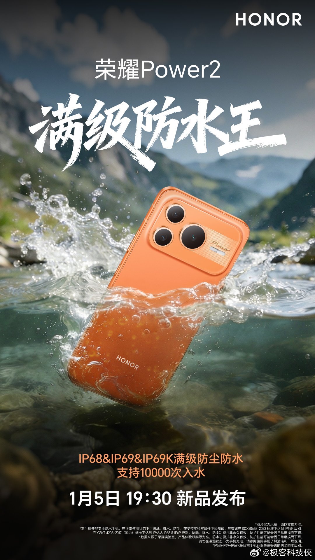 这次的荣耀Power2 妥妥的满级防水王!荣耀Power2,支持IP68&IP69&IP69K满级防尘防水认证,无论生活泼溅亦或山野极限,什么水,都能防!有这方面的困扰的朋友们可以关注一下新品发布会在1月5日,值得期待!