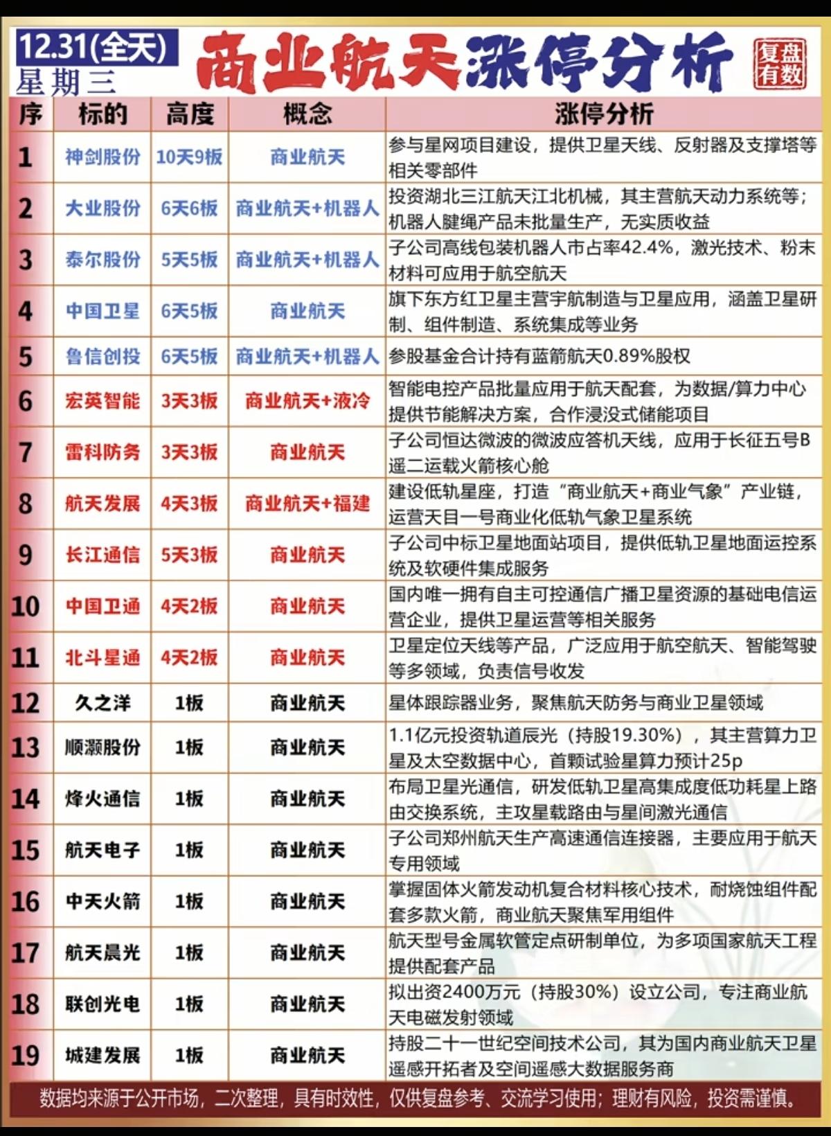 12.31周三商业航天涨停分析! 市场热点仍然是商业航天,再叠加机器人,液