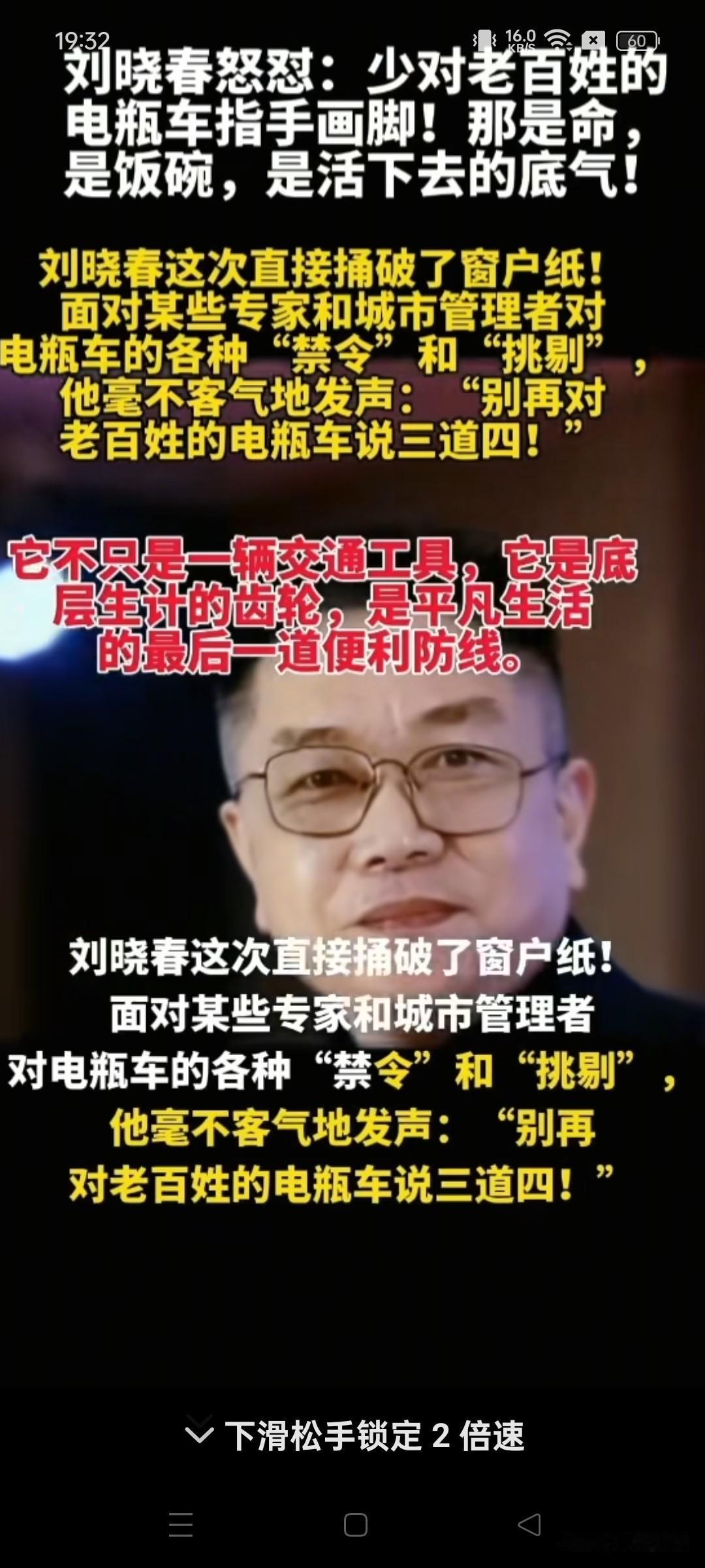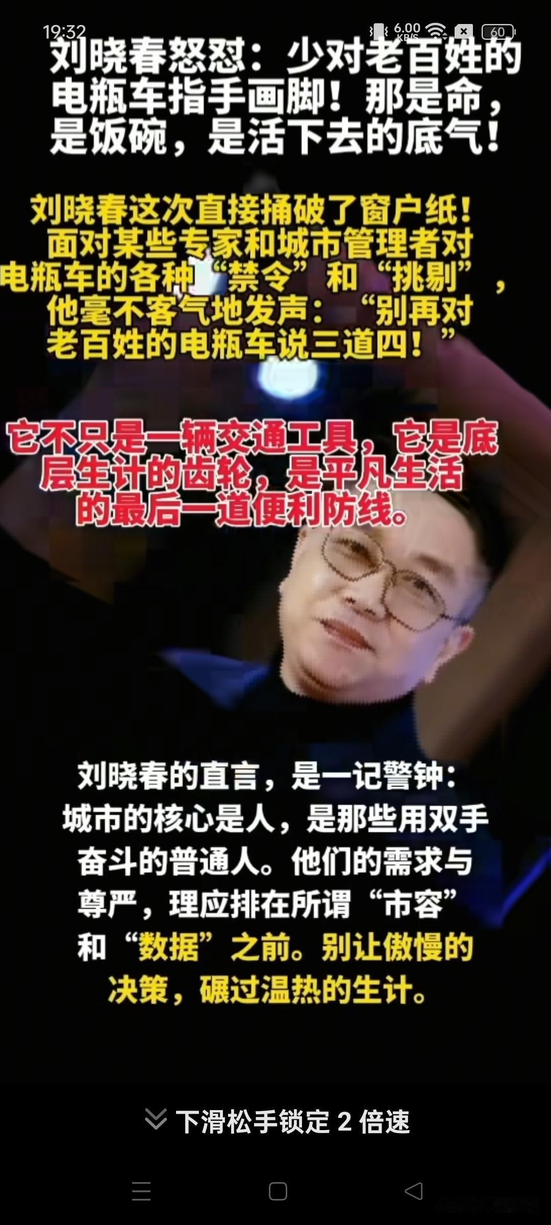 “戳到痛点了”,近期,刘晓春针对电瓶车的相关禁令发布的言论,引起了网友一致认同。 面对部分专家和城市管理者对电瓶车出台的各类“禁令”与严苛限制,他直言不讳地怒怼这种脱离民生的规制行为,喊出“少对老百姓的电瓶车指手画脚”的呼声。 在他看来,电瓶车绝非单纯的交通工具,而是底层民众的生计依托——是外卖员、小商贩谋生的饭碗,是普通家庭日常出行的便利保障,更是普通人活下去的底气。 那些一刀切的禁令,看着是为了规矩,实则不管老百姓的死活。刘晓春这话一喊,算是把底层人的心声说出来了,也让大家琢磨:城市管理,总不能寒了老百姓的心吧!