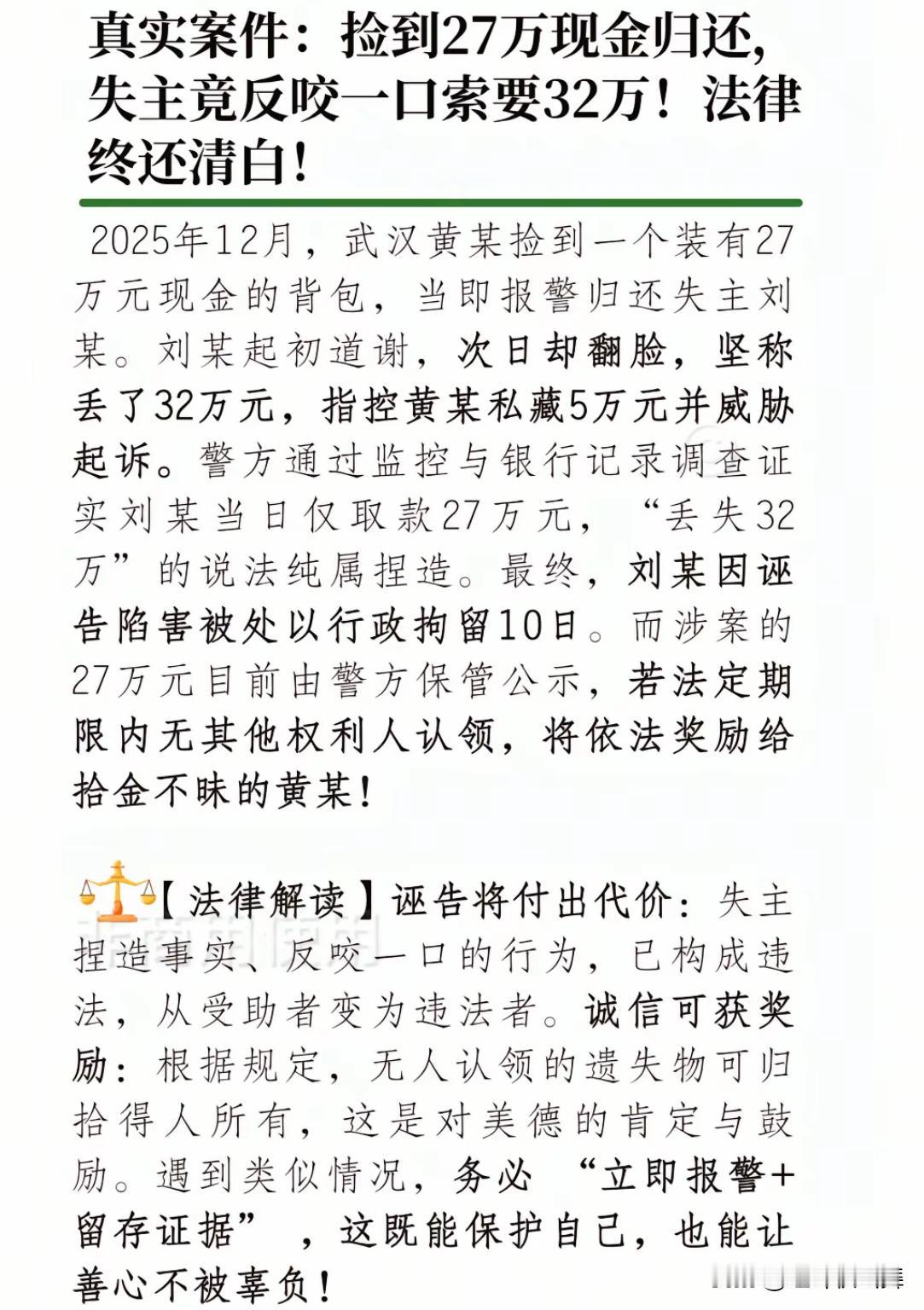 拾金不昧有风险?近日发生在武汉的一起此类事件的判罚,令人大快人心。本月(12月),黄某捡到一个背包,为寻找失主线索,于是打开了背包。结果发现里面竟然装有27万的现金!黄某见此,没有其他念头,立即选择了报J,在J察到场后清点交割。J察多方查询后,联系到了失主刘某,刘某到场后领回背包并向黄某表示了感谢。本以为故事就此结束,谁料在第二天,刘某竟然到J局称背包里原有现金是32万,现在只有27万,要求黄某归还差额5万!黄某接到电话后异常气愤,有感到有些慌。没想到以前在新闻中看到的事竟然在他身上发生了!面对刘某的诬陷,黄某百口莫辩。幸而J方通过调查取证,发现刘某背包里确实只有27万。于是对其敲zha和诬陷行为作出了拘留十日的处罚,并且把27万收回代管。如果在规定日期内,无其他权利人认领,这笔钱将作为奖励给拾金不昧的黄某。意思是:这笔如果只有刘某一个权利人,那它就会成为黄某的奖金!大家觉得如此处理是不是大快人心?!