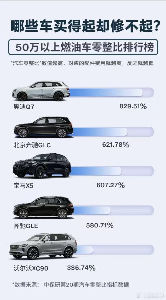 50万以上燃油车型零整比排行,豪华品牌还得看沃尔沃,既要买得放心,更要修得安心!