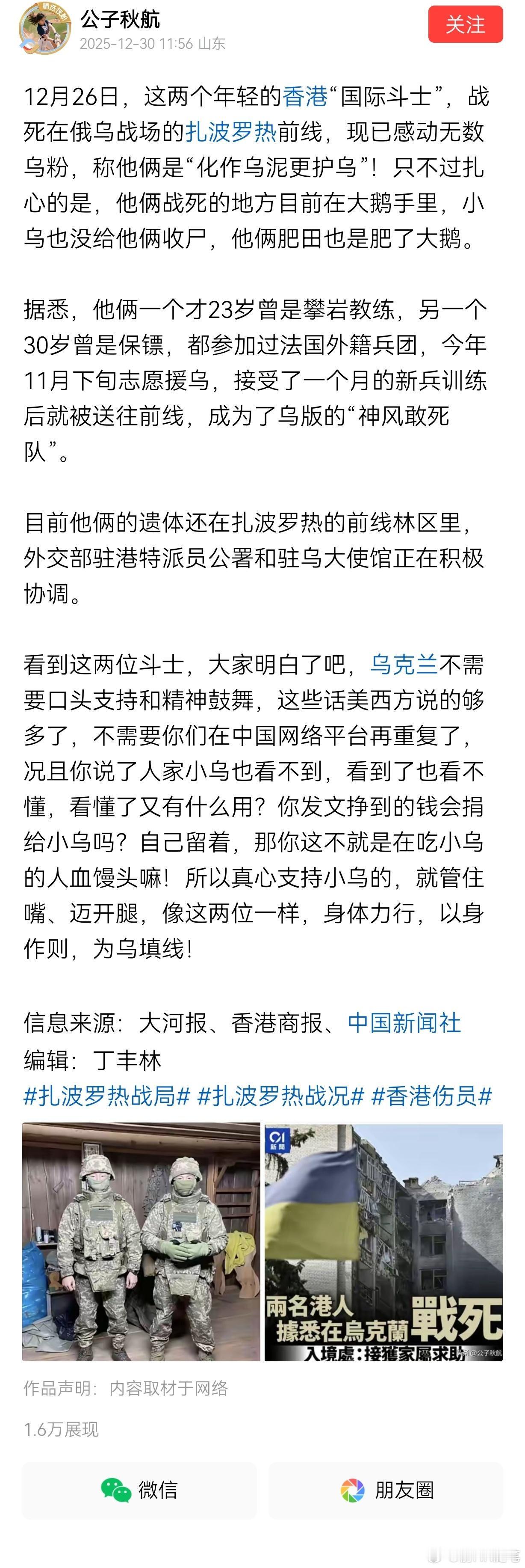 两个香港人被骗去俄乌战争前线当乌克兰炮灰了。12月26日,这两个年轻的香港“国际斗士”,战死在俄乌战场的扎波罗热前线,现已感动无数乌粉,称他俩是“化作乌泥更护乌”!只不过扎心的是,他俩战死的地方目前在大鹅手里,小乌也没给他俩收尸,他俩肥田也是肥了大鹅。有人把他的最后一条语音发了出来。背景是风声和发动机,他说跟宣传完全不一样,训练仓促,装备东拼西凑,新人被丢去前线当补位,连地图都靠手机截图。那两分钟里,他没有骂人,也没有喊冤,只是说了一句:我好像走错了。
