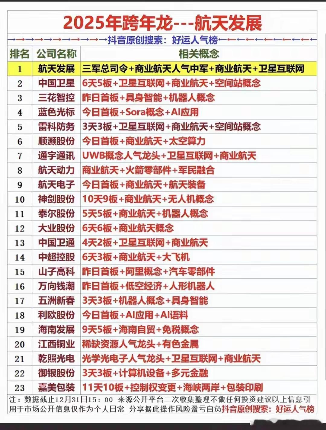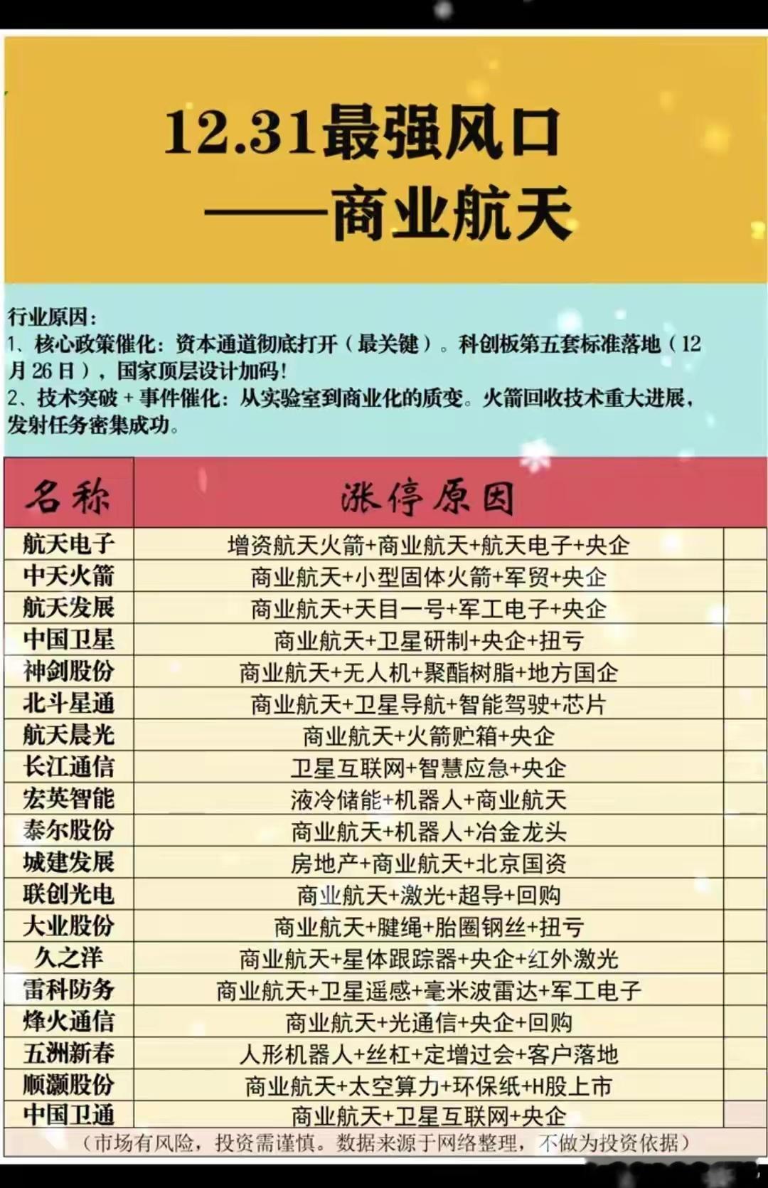 商业航天+人形机器人 双主线核心标的全梳理商业航天与人形机器人作为高景气赛道,正迎来技术突破与订单放量的双重红利。两大领域核心标的深度卡位产业链关键环节,兼具技术壁垒与业绩确定性,成为当前市场稀缺的持续性主线。一、 双赛道并行核心标的(10强)1. 昊志机电(300503)商业航天:蓝箭航天“天鹊B”液氧甲烷发动机特种电机独家供应商,单台发动机配套4台高可靠性电机,2025年实现小批量盈利。人形机器人:谐波减速器通过特斯拉Optimus验证,锁定2025-2028年50万套订单,自研无框力矩电机+六维力传感器,实现核心部件全栈覆盖。2. 超捷股份(301005)商业航天:蓝箭航天、天兵科技核心供应商,箭体壳段、燃料贮箱等结构件单枚火箭价值达千万元,2025年订单爆满批量交付;供应可回收火箭钛合金紧固件,绑定SpaceX与国内G60星链项目。人形机器人:PEEK材质精密紧固件获智元机器人小批量订单,减重超60%,正推进特斯拉等头部客户送样验证。3. 五洲新春(603667)商业航天:通过新春宇航为蓝箭航天供应航天轴承,参股洛轴强化技术储备,卡位火箭动力系统核心环节。人形机器人:特斯拉Optimus丝杠核心供应商,谐波减速器轴承打破海外垄断,2025年相关产能计划提升300%。4. 豪能股份(603809)商业航天:朱雀三号整流罩独家供应商,深度绑定头部火箭厂商,提供火箭核心结构件。人形机器人:高精密减速器批量供货特斯拉、智元机器人,2025年订单同比大增200%,完美适配Optimus下肢关节需求。5. 大业股份(603278)商业航天:参股湖北三江航天江北机械,为航天动力系统提供高强度金属基复合材料。人形机器人:与北邮联合研发腱绳材料,可耐受数万次拉伸无断裂,已向特斯拉产业链送样,用于Optimus灵巧手制造。6. 楚江新材(002171)商业航天:子公司天鸟高新航天固体火箭发动机喷管喉衬预制体市占率超60%,技术壁垒极高。人形机器人:子公司天鸟高新生产抗干扰线束、高精度导体材料,通过美军标认证,适配机器人复杂电路系统。7. 华伍股份(300095)商业航天:天兵科技天龙三号发射台制动系统独家供应商,中标2025年发射场扩建项目订单超6亿元。人形机器人:电磁超薄制动器厚度减半,实现毫秒级制动,符合国际安全标准,精准匹配协作机器人需求。8. 龙溪股份(600592)商业航天:2025年斩获200万套航天轴承订单,产品用于火箭发射台姿态调整与卫星姿态控制。人形机器人:高端关节轴承量产交付特斯拉Optimus,打破海外企业长期垄断格局。9. 成都华微(688709)商业航天:获航天科工订单,高精度ADC和MCU芯片保障卫星制导与导航精准度。人形机器人:边缘AI芯片配套优必选、宇树科技伺服驱动系统,赋予机器人智能决策能力。10. 四川金顶(600678)商业航天:推进“开物星座”计划,2029年完成12颗卫星组网,为太空采矿提供数据支撑。人形机器人:子公司研发全球首款矿山混合动力人形机器人Ares-X1,碳纤维关节可承载50公斤负载,已启动小批量试用。二、 商业航天核心趋势标的(12强)1. 航天动力:液氧煤油发动机龙头,为太空算力卫星发射火箭提供核心动力,是板块容量中军。2. 中国卫星:卫星总装领域绝对龙头,承担太空算力卫星总装集成,是产业链最直接受益标的。3. 航天电子:供应卫星激光模块,适配卫星通信与数据传输需求,位置低、走势稳健。4. 西部材料:国内唯一火箭发动机热端铌合金供应商,耐温达2468℃,2025年SpaceX订单占比70%。5. 再升科技:全球仅三家能生产航空级超细纤维棉的企业之一,阻燃绝热性能优异,稳定供应星链与C919。6. 雷科防务:星载滤波器核心供应商,保障太空算力卫星信号传输质量,是卫星信号处理关键环节。7. 乾照光电:布局空间太阳能领域,为太空算力卫星提供在轨供电部件,筑牢卫星能源保障。8. 顺灏股份:参股轨道辰光,通过股权纽带间接切入太空算力产业链。9. 普天科技:直接参与空间算力网络构建,推动组网落地,是太空算力基建核心参与者。10. 信维通信:星链地面终端连接器独家供应商,配套星舰天线,市占率近100%,2025年卫星通信业务收入剑指15亿元。11. 天银机电:星链三代卫星恒星敏感器龙头,定位精度达0.001°,全球市占率超60%,毛利率超55%。三、 赛道核心逻辑分析SpaceX IPO预期催化商业航天规模化发展,全球核心部件需求持续放量。国内赛道兼具政策强力支持与业绩兑现预期,在弱势行情下凸显稀缺的持续性。两大主线技术迭代与订单落地加速,核心标的的业绩确定性与成长空间值得重点关注。