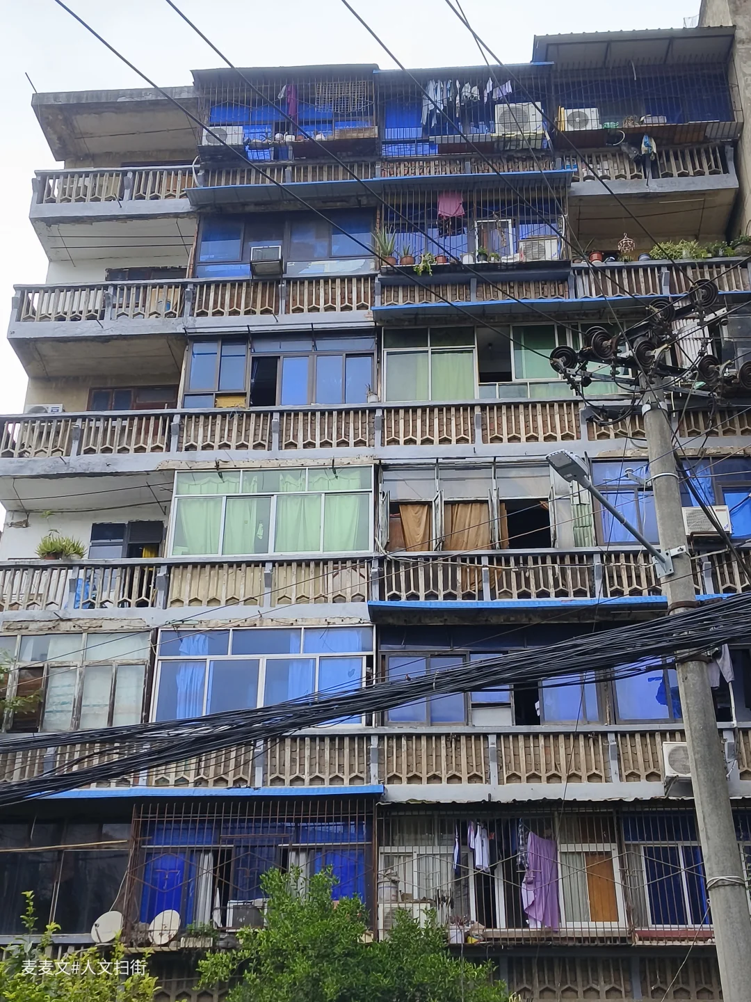 走进川煤十二处家属区,数十栋老旧的居民楼映入眼帘。楼体虽有些斑驳,却满是生活气息。镂空阳台上晾晒的衣物随风轻摆,仿佛在诉说着日常的琐碎与温馨。经典蓝色玻璃窗户上的窗帘色彩各异,为这方天地增添了几分灵动。杂乱的电线在空中交织,似是岁月留下的无序诗篇。