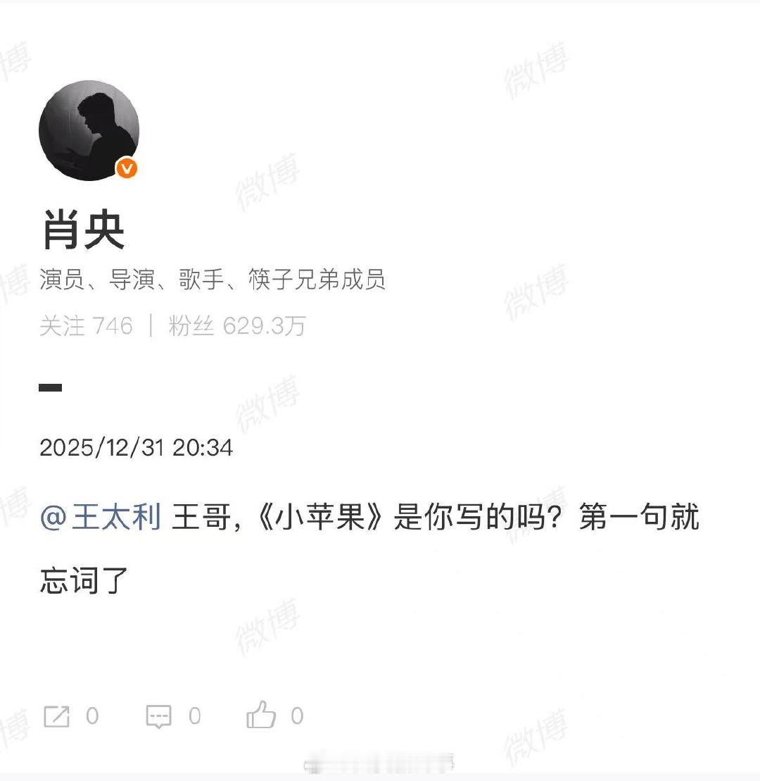 【肖央回应跨年晚会上跑调】肖央调侃王太利小苹果忘词12月31日,在2025年东方卫视跨年晚会上,筷子兄弟演唱《小苹果》时出现跑调、忘词等问题,引发观众热议,相关话题筷子兄弟跑调迅速登上热搜。刚刚,发文调侃称,王哥,《小苹果》是你写的吗?第一句就忘词了 !