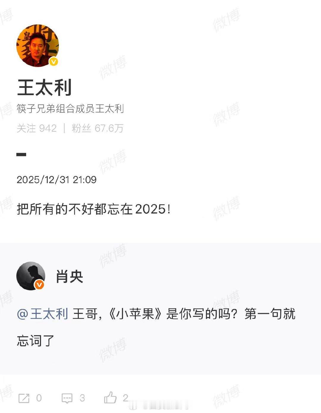 【王太利回应跨年晚会小苹果忘词】王太利回应跨年晚会忘词 12月31日,在2025年东方卫视跨年晚会上,筷子兄弟演唱《小苹果》时出现跑调、忘词等问题,引发观众热议,相关话题筷子兄弟跑调迅速登上热搜。刚刚,筷子兄弟组合成员发文回应称,把所有的不好都忘在2025年!