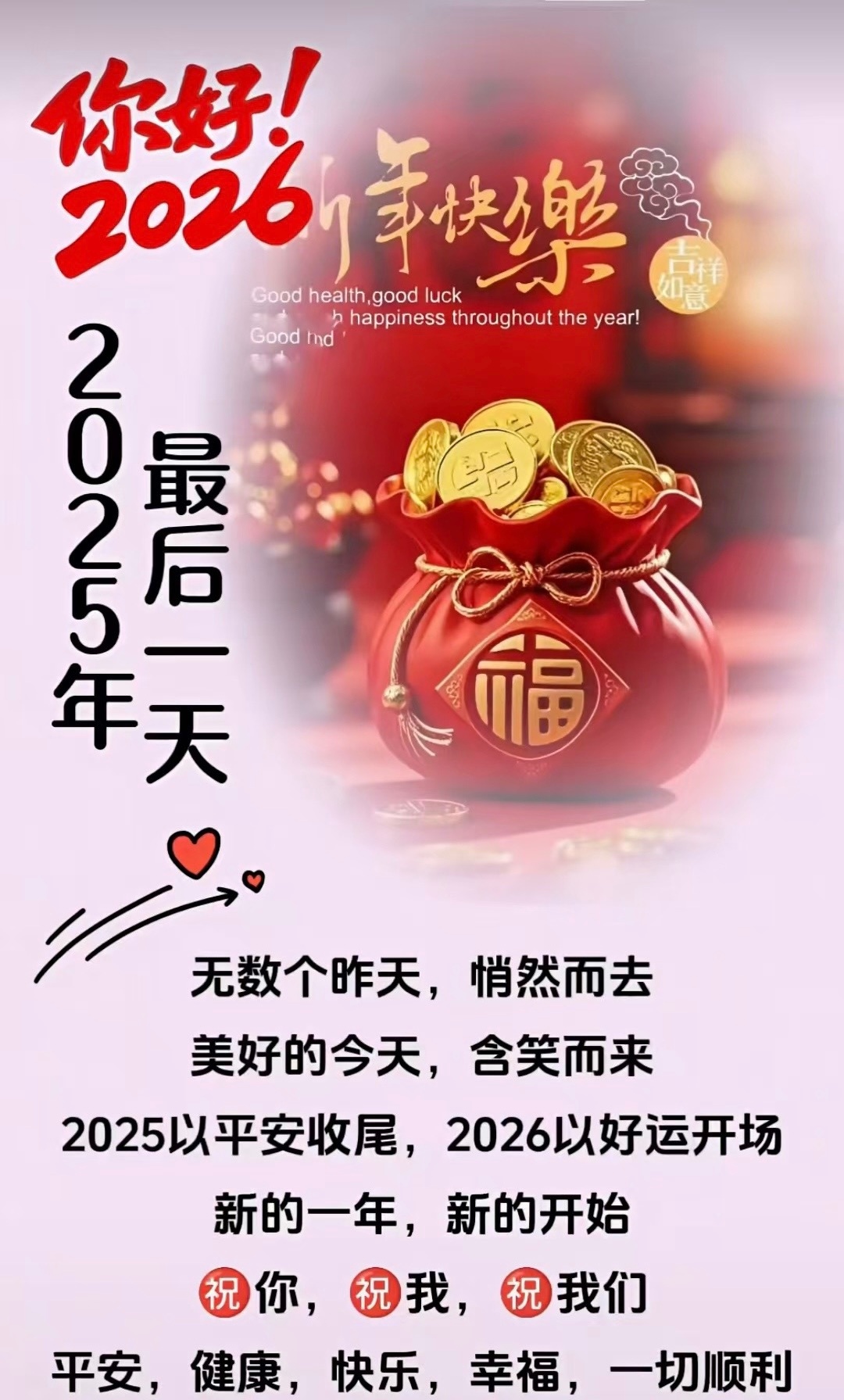 ✋再见,2025🤝你好,2026今天,2025年12月31日,和2025好好道个别吧!尽我所能,也敬我不能。尽我所能,是对自己的肯定,对明天的希望;敬我不能,是对规律的尊重,对过往的释怀。一山又一山,山山相连;一程又一程,程程跋涉。千山过尽的我们,终将迎来万里星辰。愿2026年多喜乐,长安宁,岁无忧。所行皆坦途,所遇皆美好。平安健康!万事胜意!